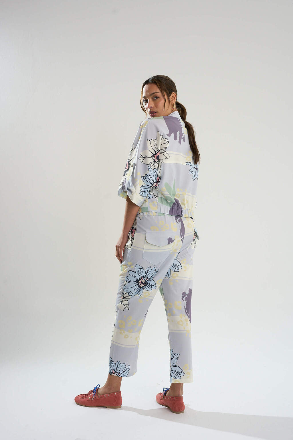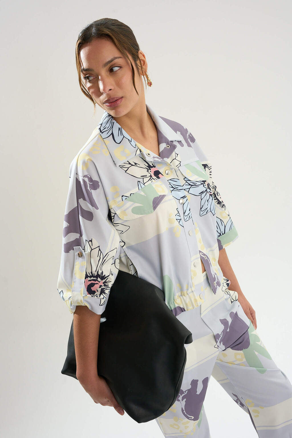 La camisa Lupe es de Praga tiene seis broches a presión al frente y elástico en la cintura. El modelo viene con mangas ¾ tipo japonesa y presilla con botón a presión para arremangar. El largo es hasta la primera cadera y tiene dos solapas al frente como detalle.