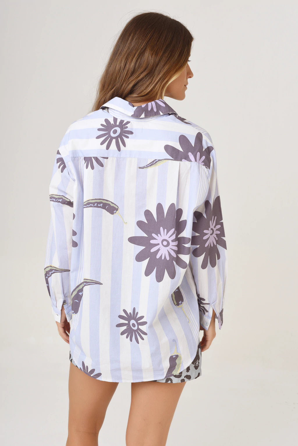 La camisa Carmen está confeccionada en Poplin de algodón, tiene 7  botones al frente a tono, es corte oversize y tiene un bolsillo al frente. Su terminación es redondeada con un pequeño tajo en cada lateral y tiene un botón en cada puño.