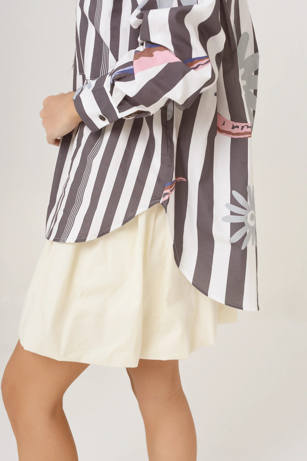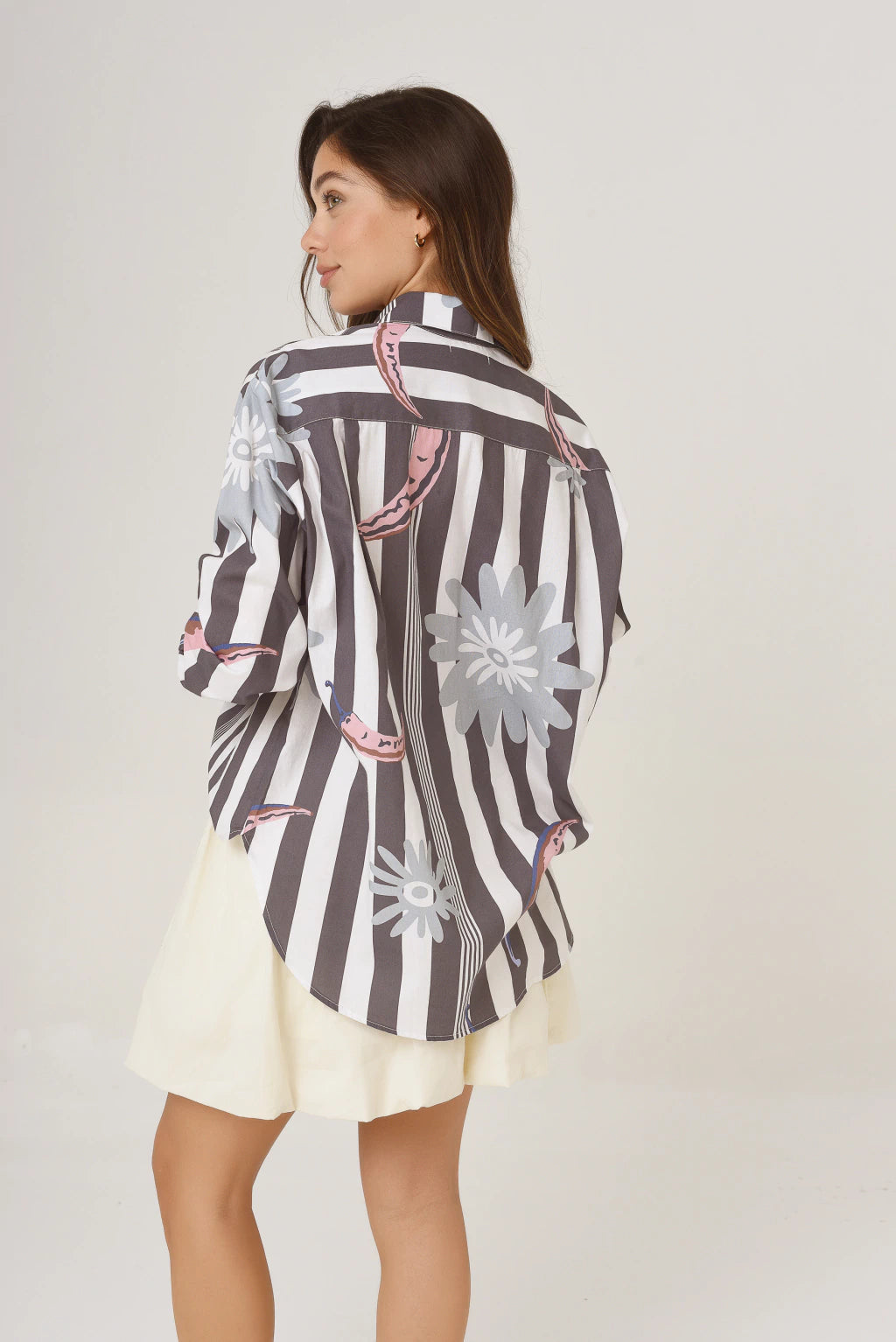La camisa Carmen está confeccionada en Poplin de algodón, tiene 7 botones al frente a tono, es corte oversize y tiene un bolsillo al frente. Su terminación es redondeada con un pequeño tajo en cada lateral y tiene un botón en cada puño.