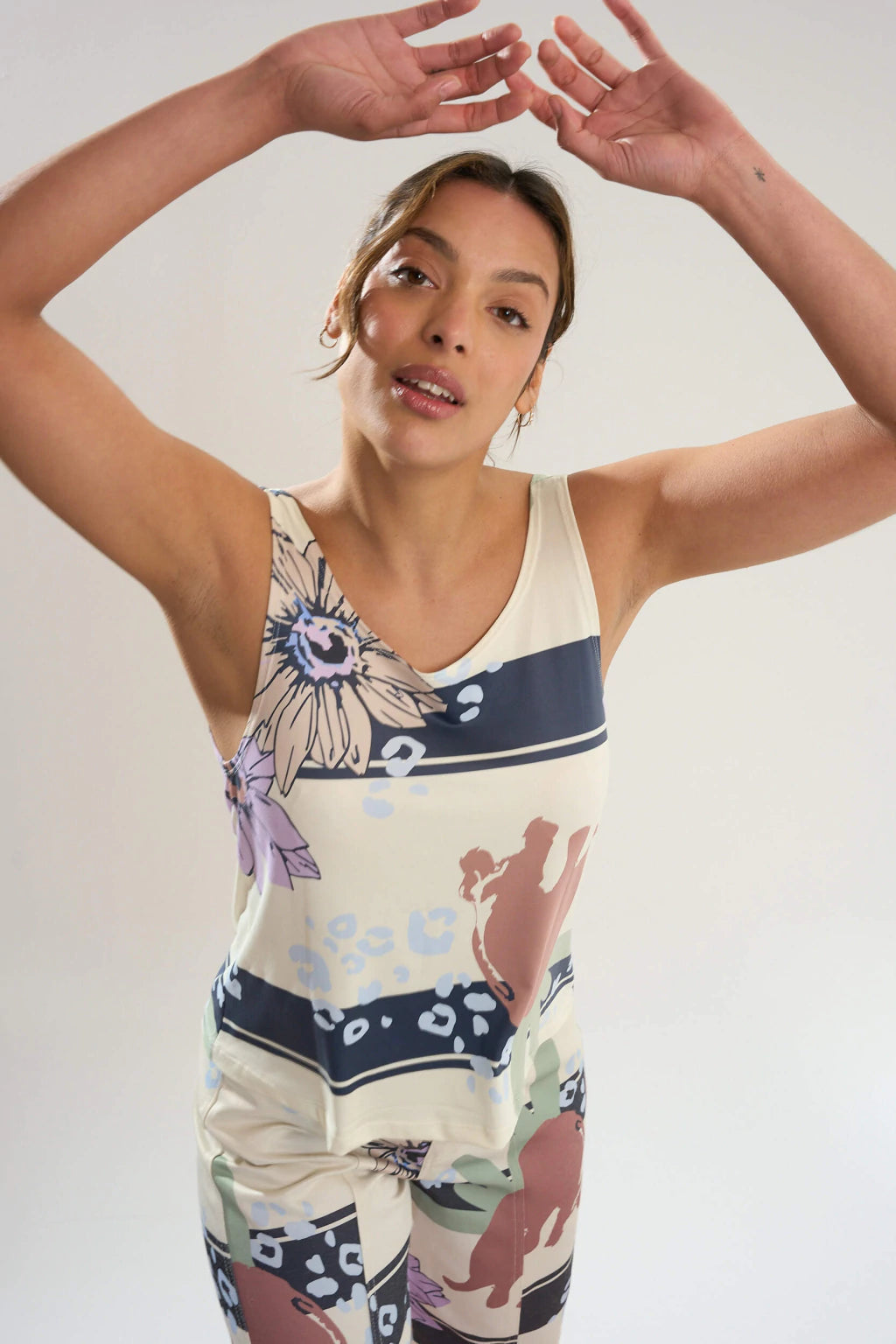 La musculosa Tulum está confeccionada en modal gamuzado una tela que es suave y liviana para el verano. Tiene cuello redondo y la espalda es más pronunciada que el frente. Es corte recta y larga hasta la primera cadera.