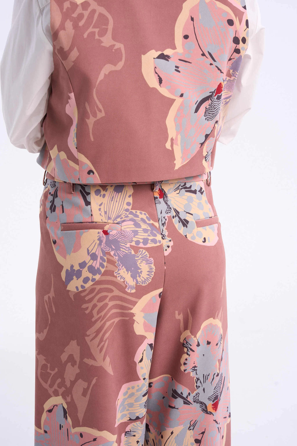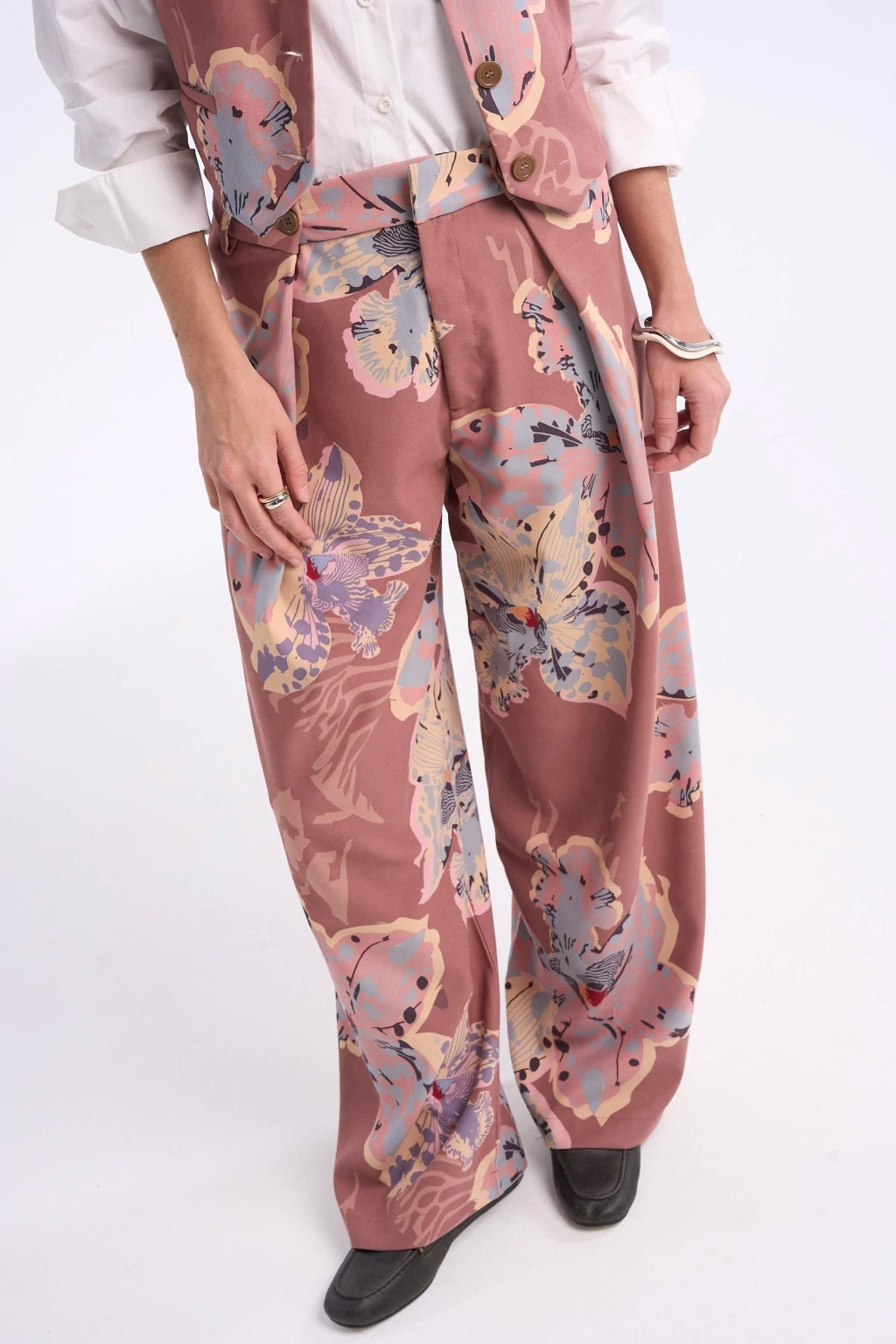 DESCRIPCIÓN: Pantalón Paris es tiro alto con pinzas delanteras y trabillas con botones. Está confeccionado en sarga gamuzada y tiene pierna ancha. Además posee bolsillos frontales y falsos bolsillos de vivo en espalda. Acceso frontal con cierre, botón interior y gancho. El calce es amplio y con tiro medio.