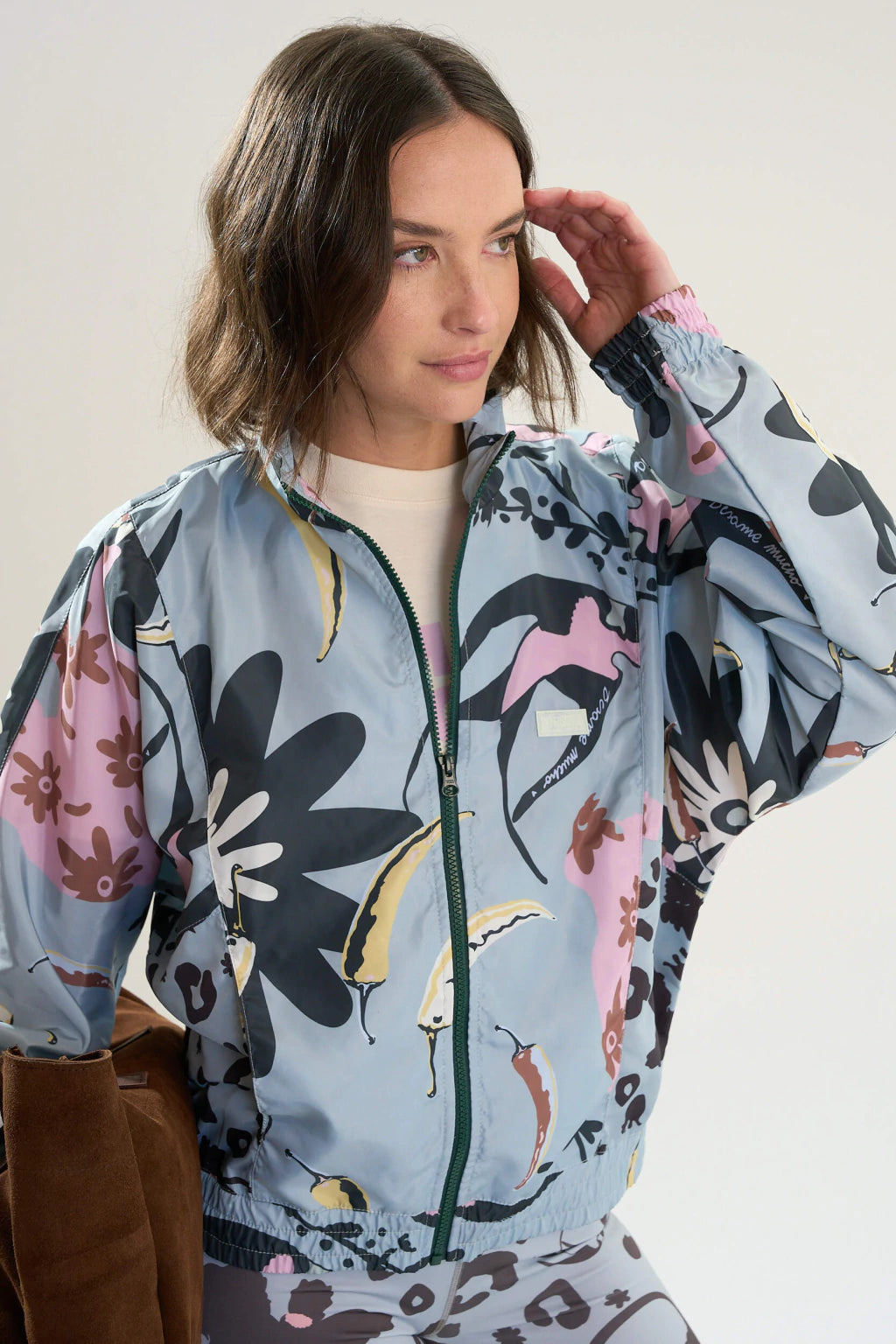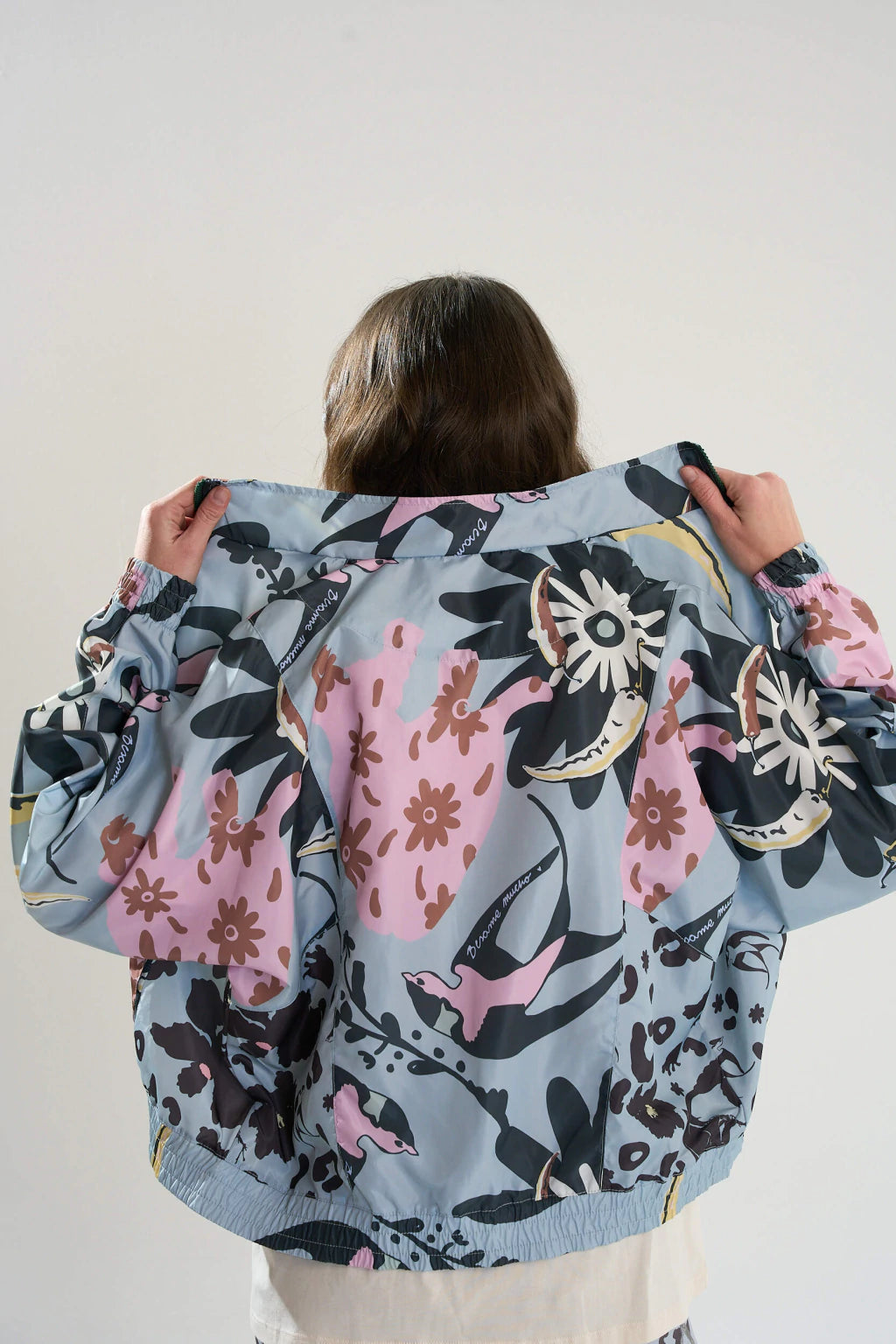 El piloto Kahlo está confeccionado en memory estampado con dos recortes laterales combinando dos estampados diferentes. Es manga larga con elástico tanto en puños como en el inferior del piloto y tiene mangas semi- murciélago con hombros caídos. Cuenta con cuello alto, cierre dientes de perro a tono y dos bolsillos al frente.