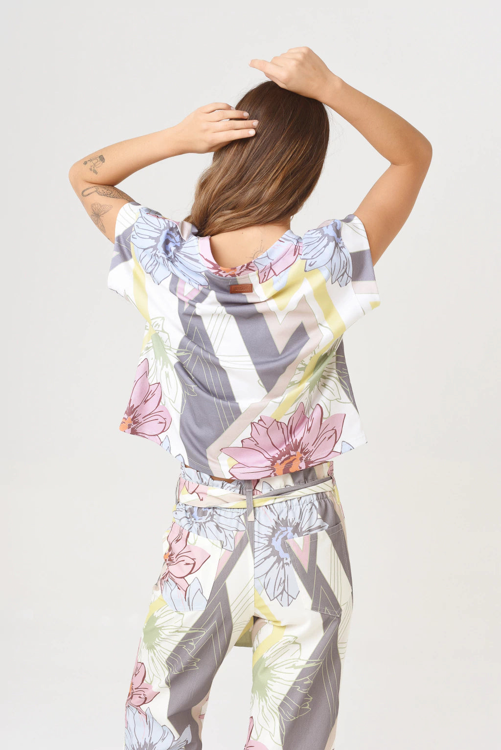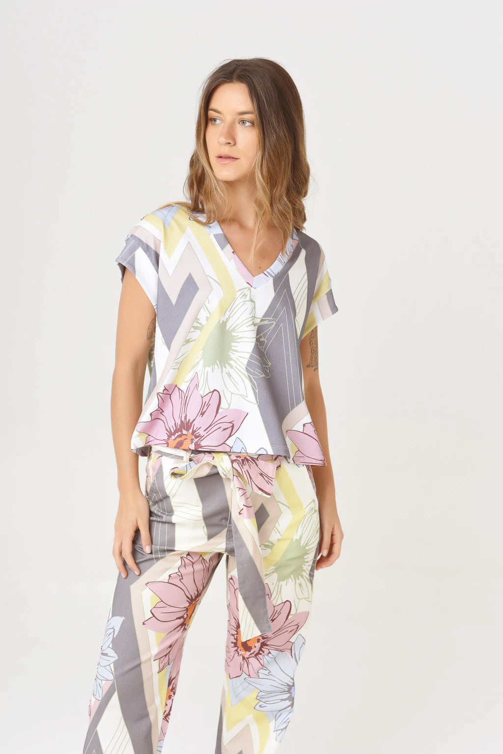 La remera Toluca está confeccionada en Jersey de algodón, tiene escote V y detalles en rib en cuello y en las mangas. Tiene hombros caídos y el largo es a la primera cadera.