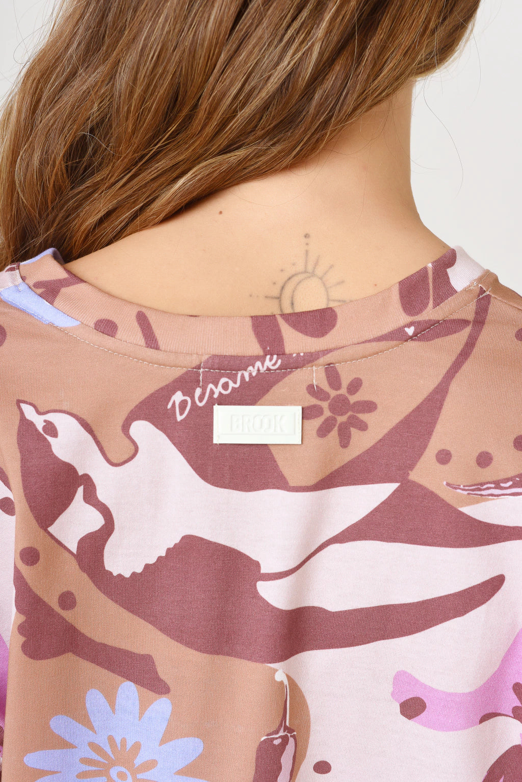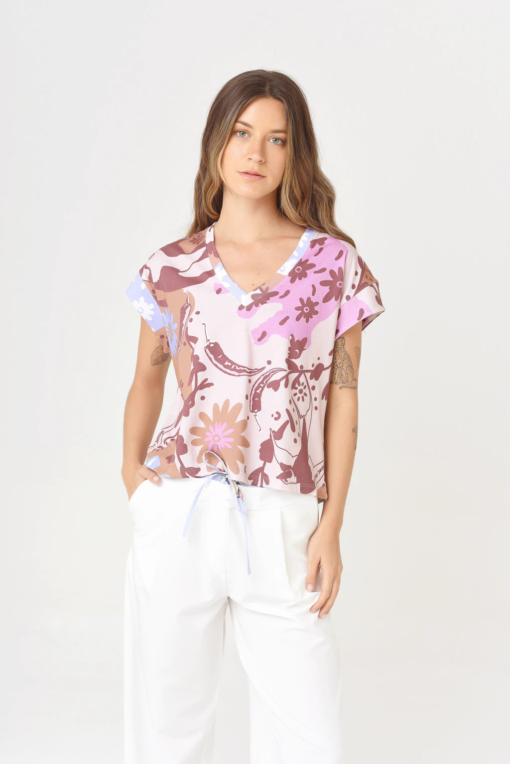 La remera Toluca está confeccionada en Jersey de algodón, tiene escote V y detalles en rib en cuello y en las mangas. Tiene hombros caídos y el largo es a la primera cadera.