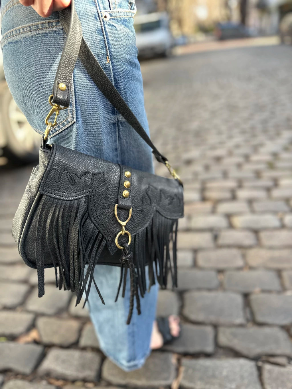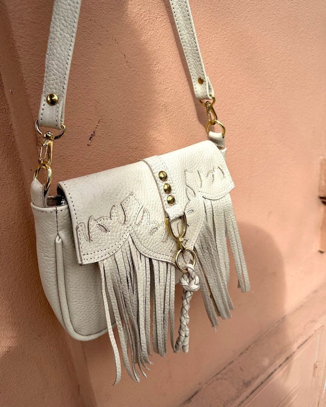 Solapa con apliques , flecos y trenza en cuero, herraje en bronce.