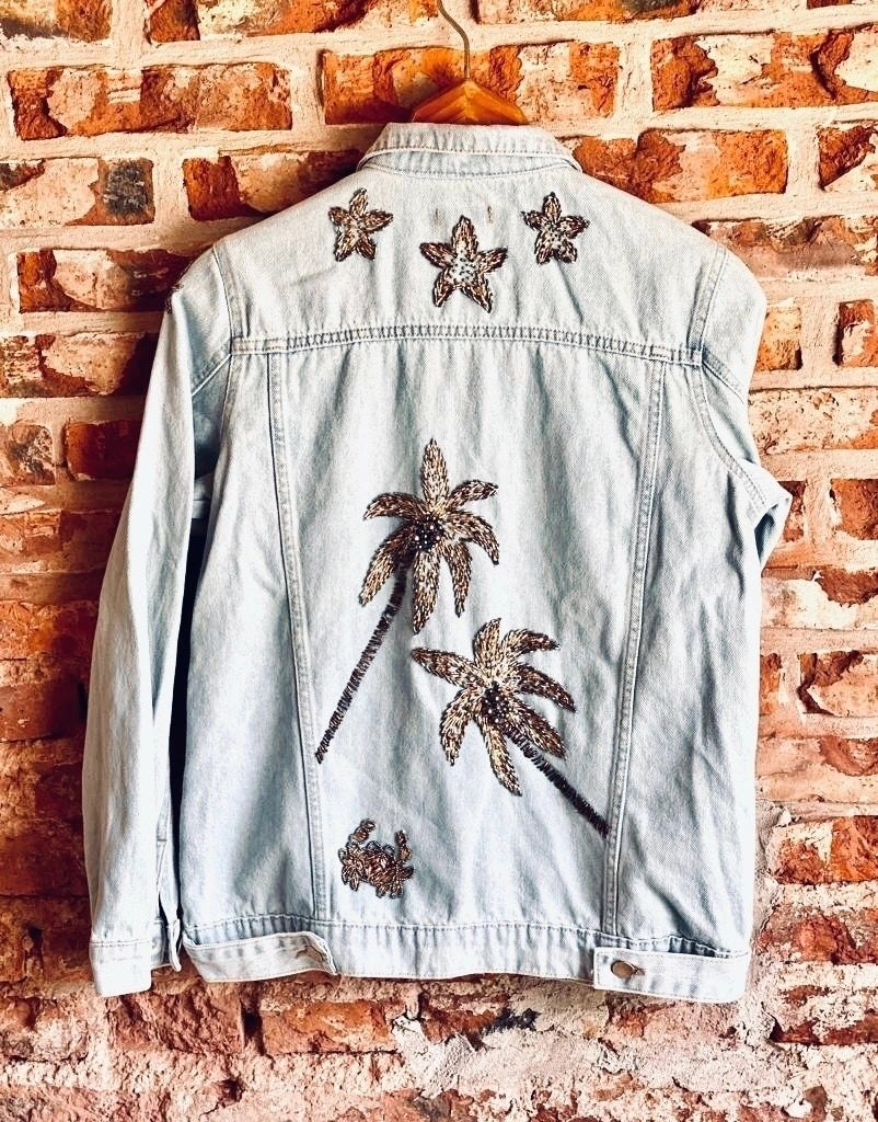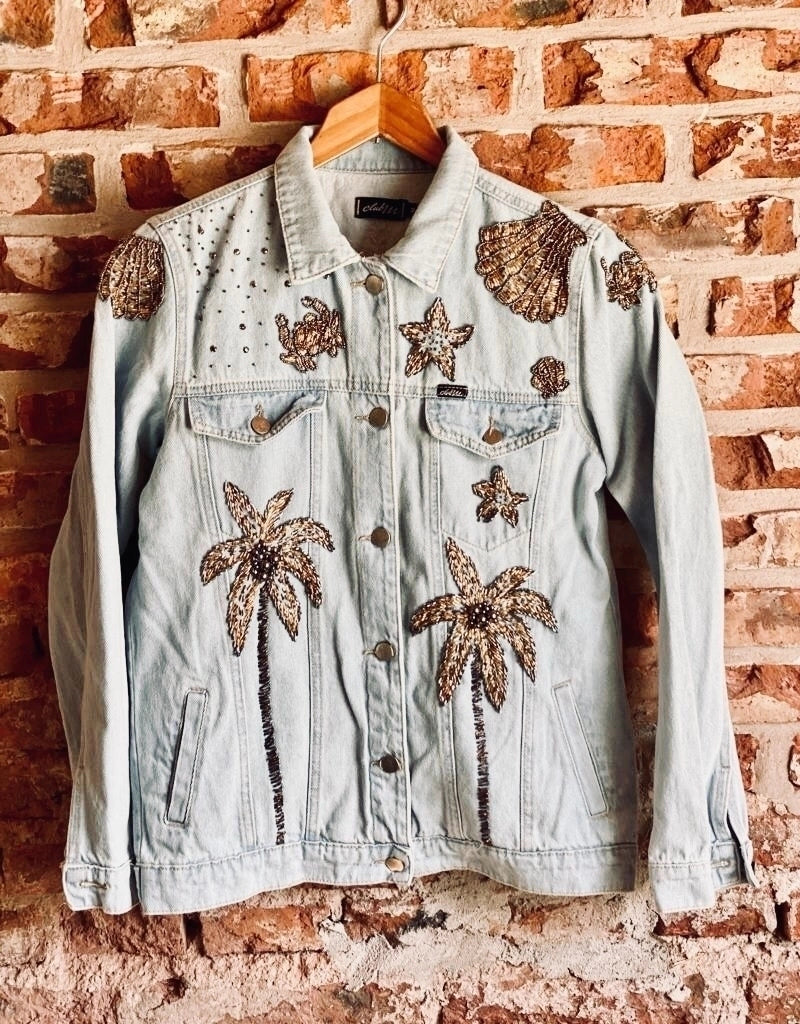 La inspiración viene del trópico: palmeras, caracoles, cangrejos y estrellas de mar que transforman esta campera en una postal de verano para usar todo el año.