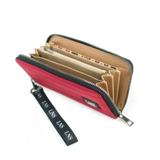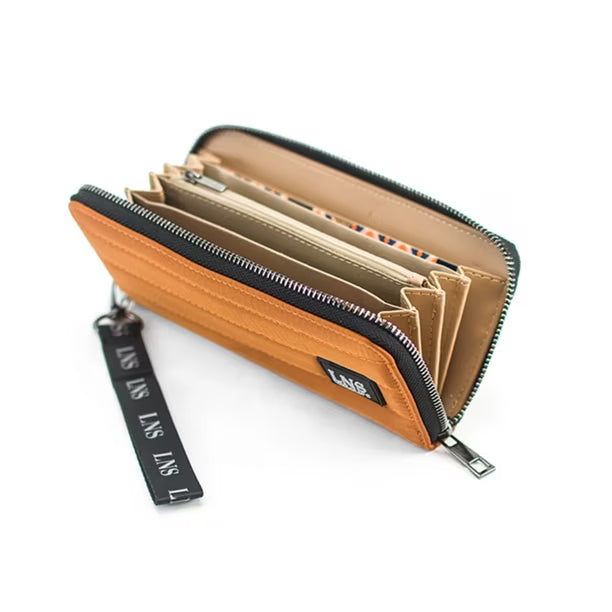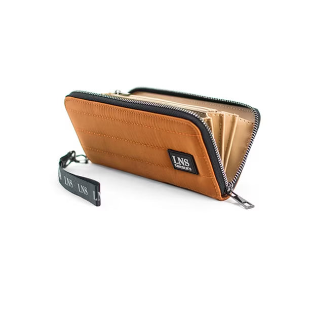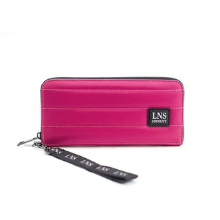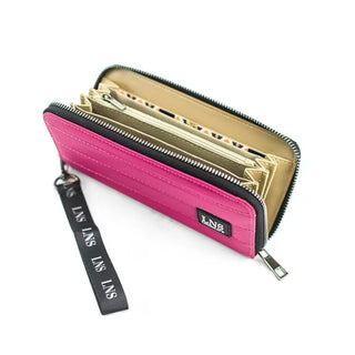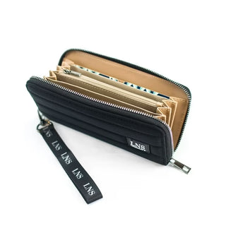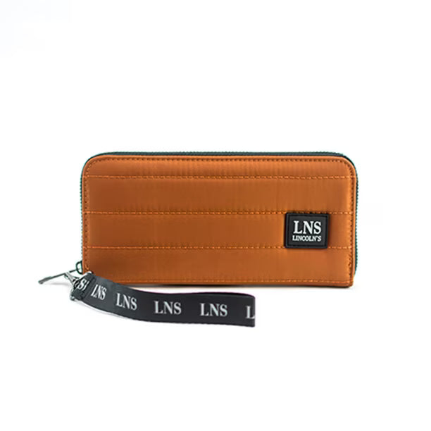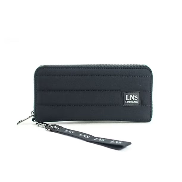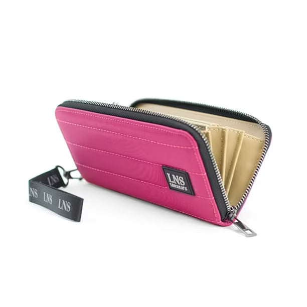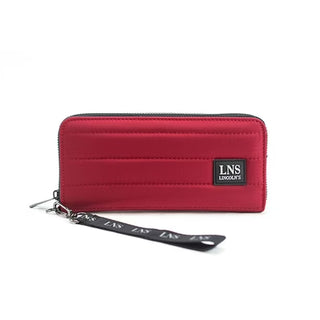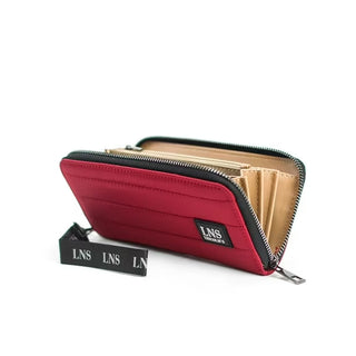 Billetera larga con cierre alrededor. Tela capitoneada.