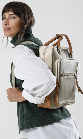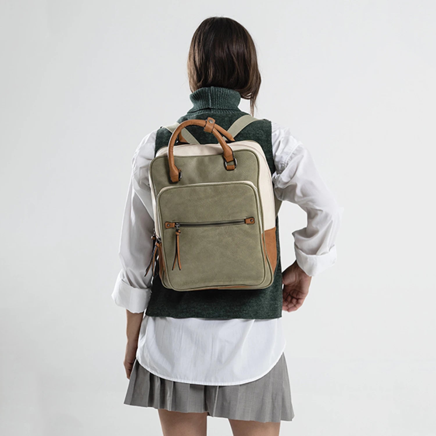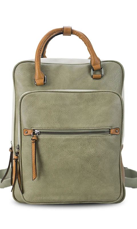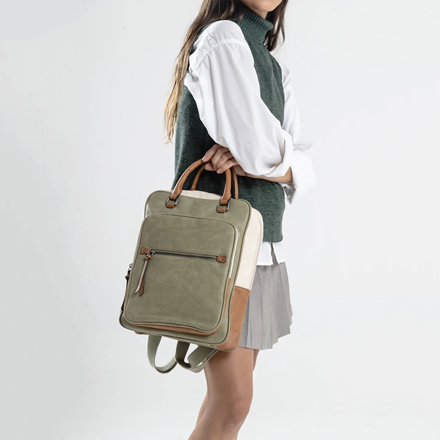 Mochila combinada en tres tonos de símil. Con doble bolsillo frontal.