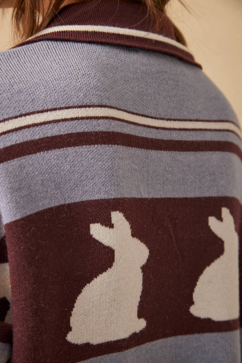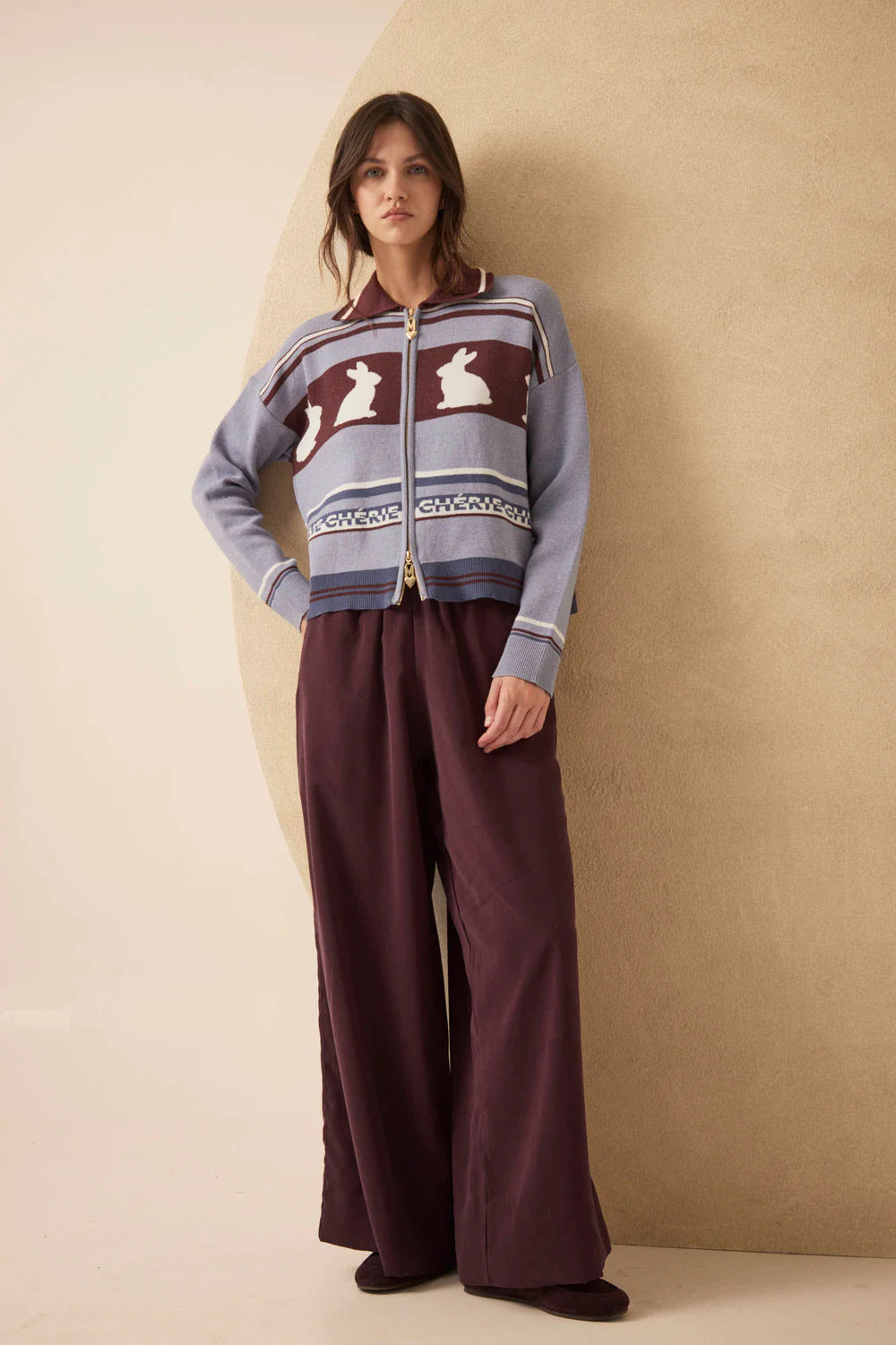 Conocé a la Campera Chérie. Tejida en jacquard con diseño exclusivo Millie de conejitos y la guarda "CHÉRIE", tiene cuello camisero y cierre dorado de doble apertura con dije corazón Millie. La podés usar abierta como cardigan o cerrada, se adapta a todo.