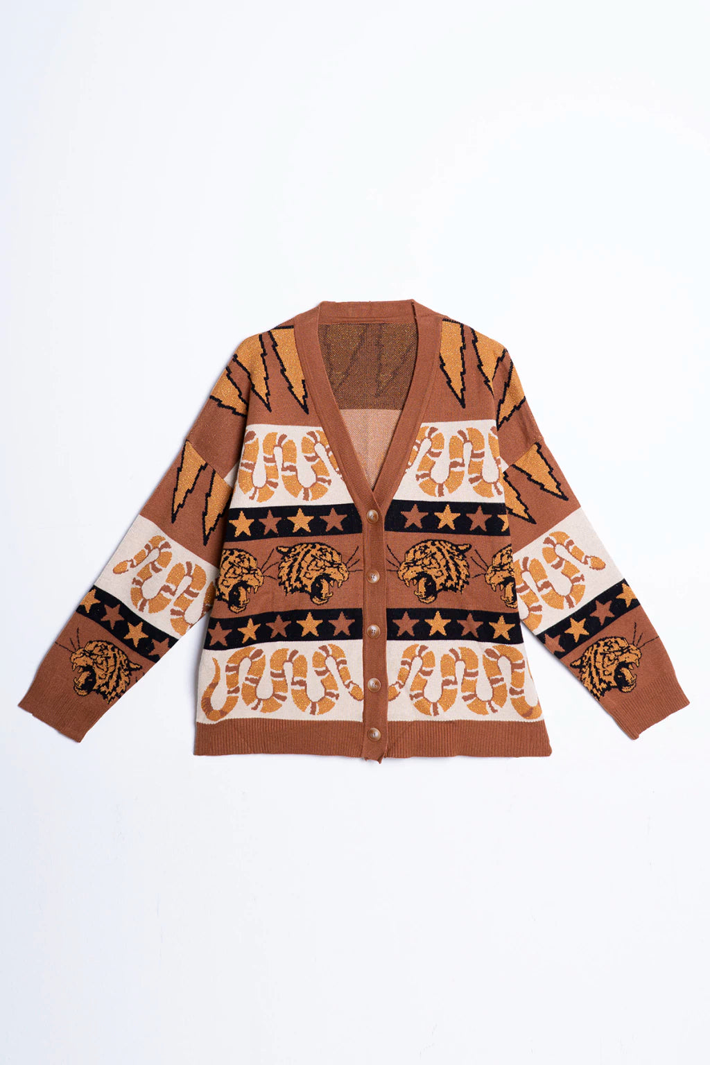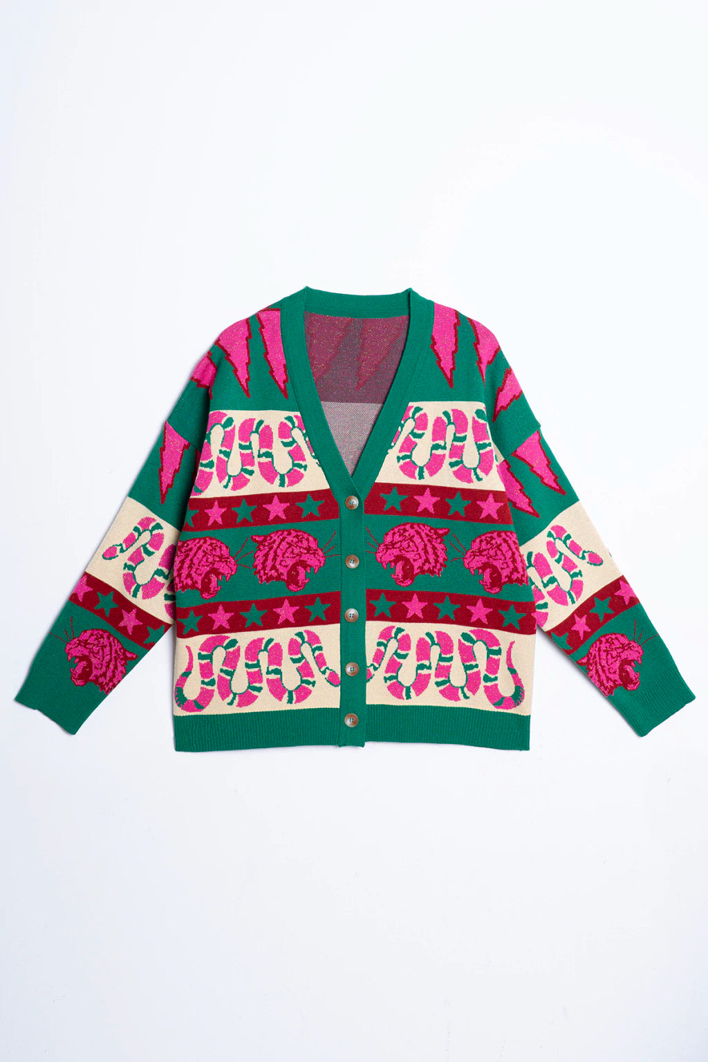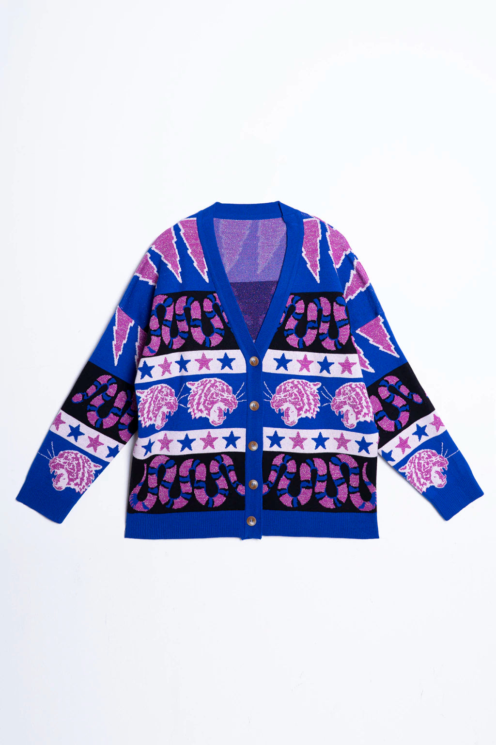 Descubrí nuestro Cardigan con serpientes, estrellas, tigres y rayos con lurex, una prenda que combina estilo y comodidad para tus días más frescos. Confeccionado con materiales de alta calidad, ofrece suavidad y calidez excepcionales. Su diseño estampado aporta un toque único y moderno, ideal para renovar tu look con personalidad. Perfecto para cualquier ocasión, este cardigan es un básico imprescindible en tu guardarropa.