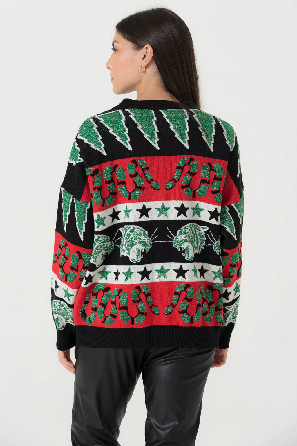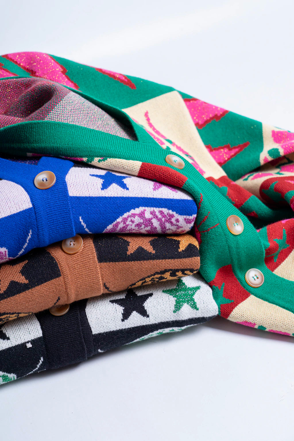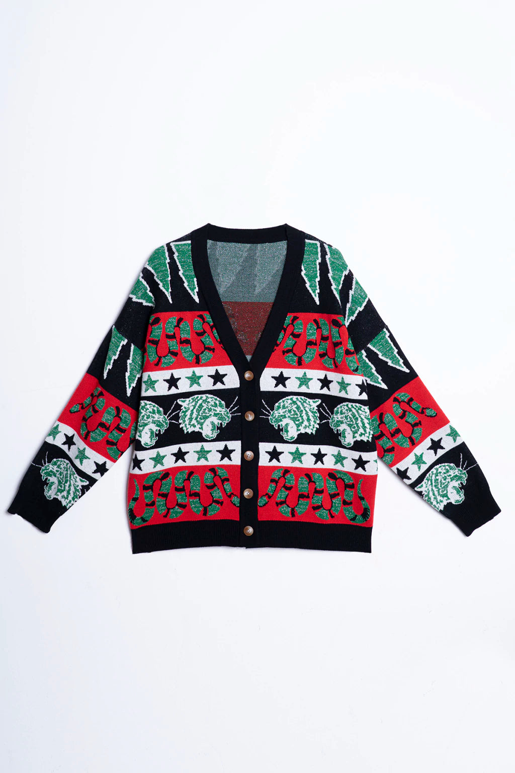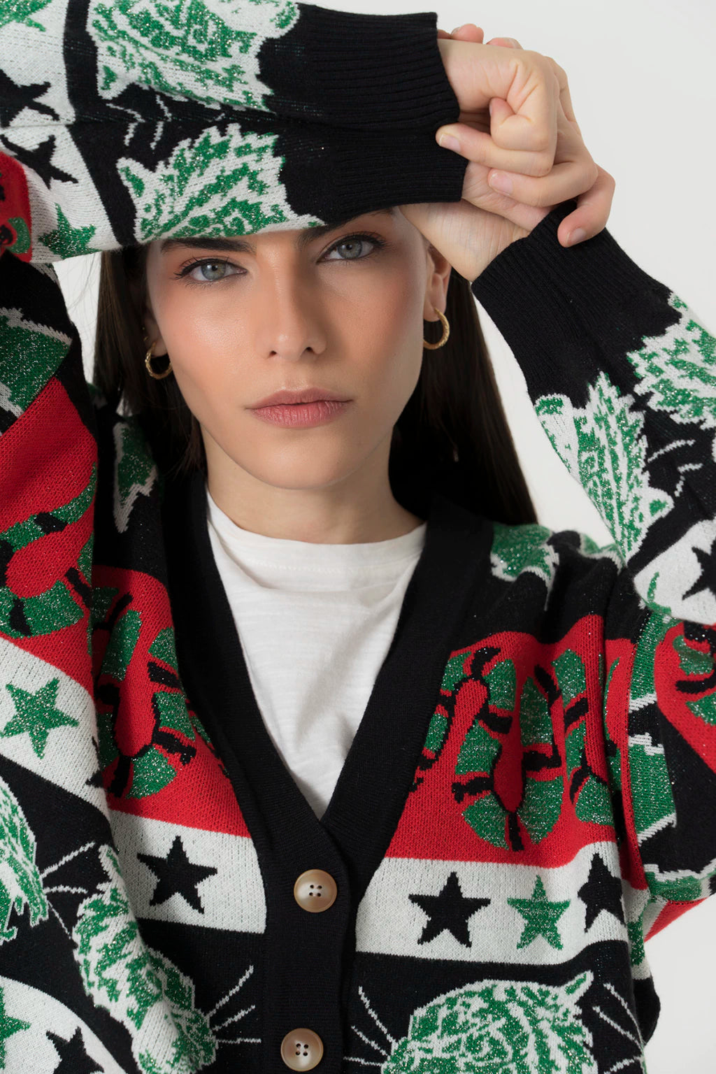 Descubrí nuestro Cardigan con serpientes, estrellas, tigres y rayos con lurex, una prenda que combina estilo y comodidad para tus días más frescos. Confeccionado con materiales de alta calidad, ofrece suavidad y calidez excepcionales. Su diseño estampado aporta un toque único y moderno, ideal para renovar tu look con personalidad. Perfecto para cualquier ocasión, este cardigan es un básico imprescindible en tu guardarropa.