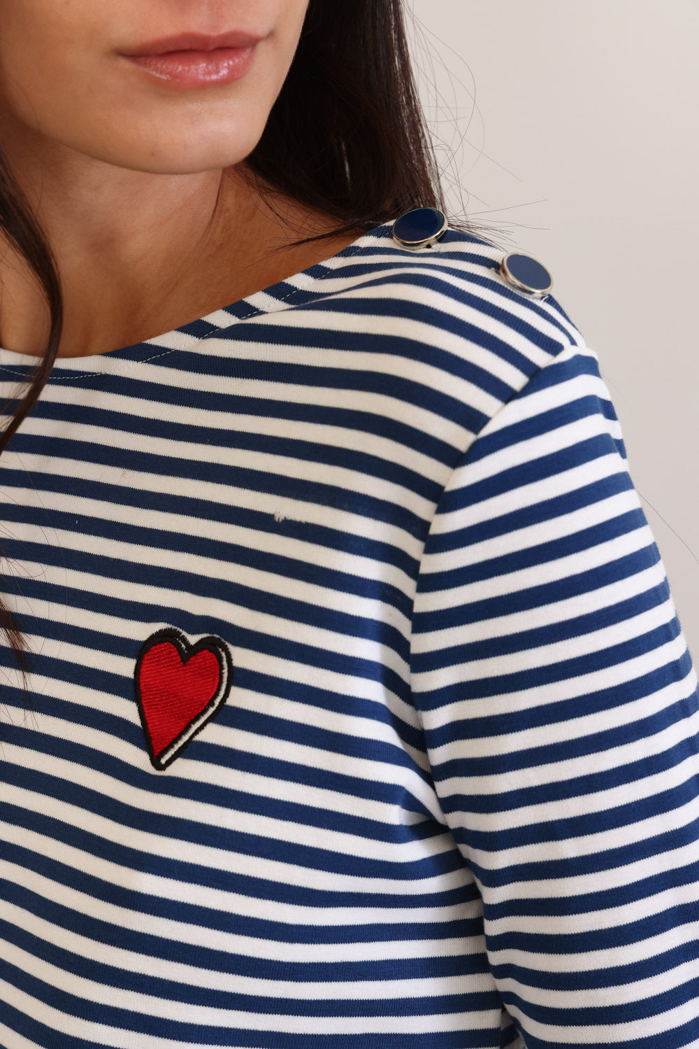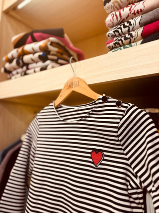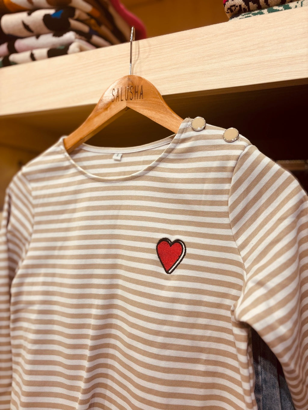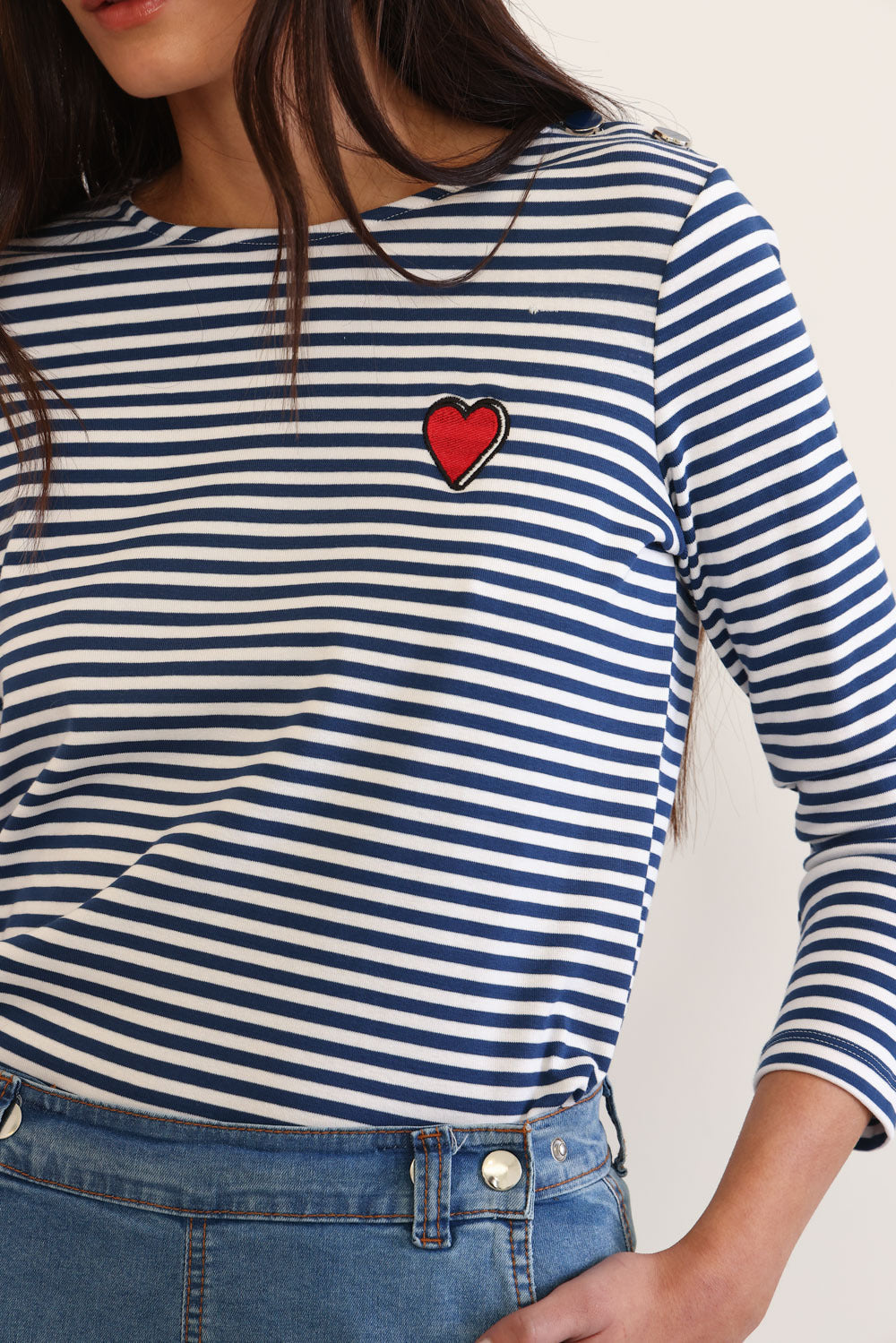 Remera de rib rayada con bordado en corazón y detalle de botones