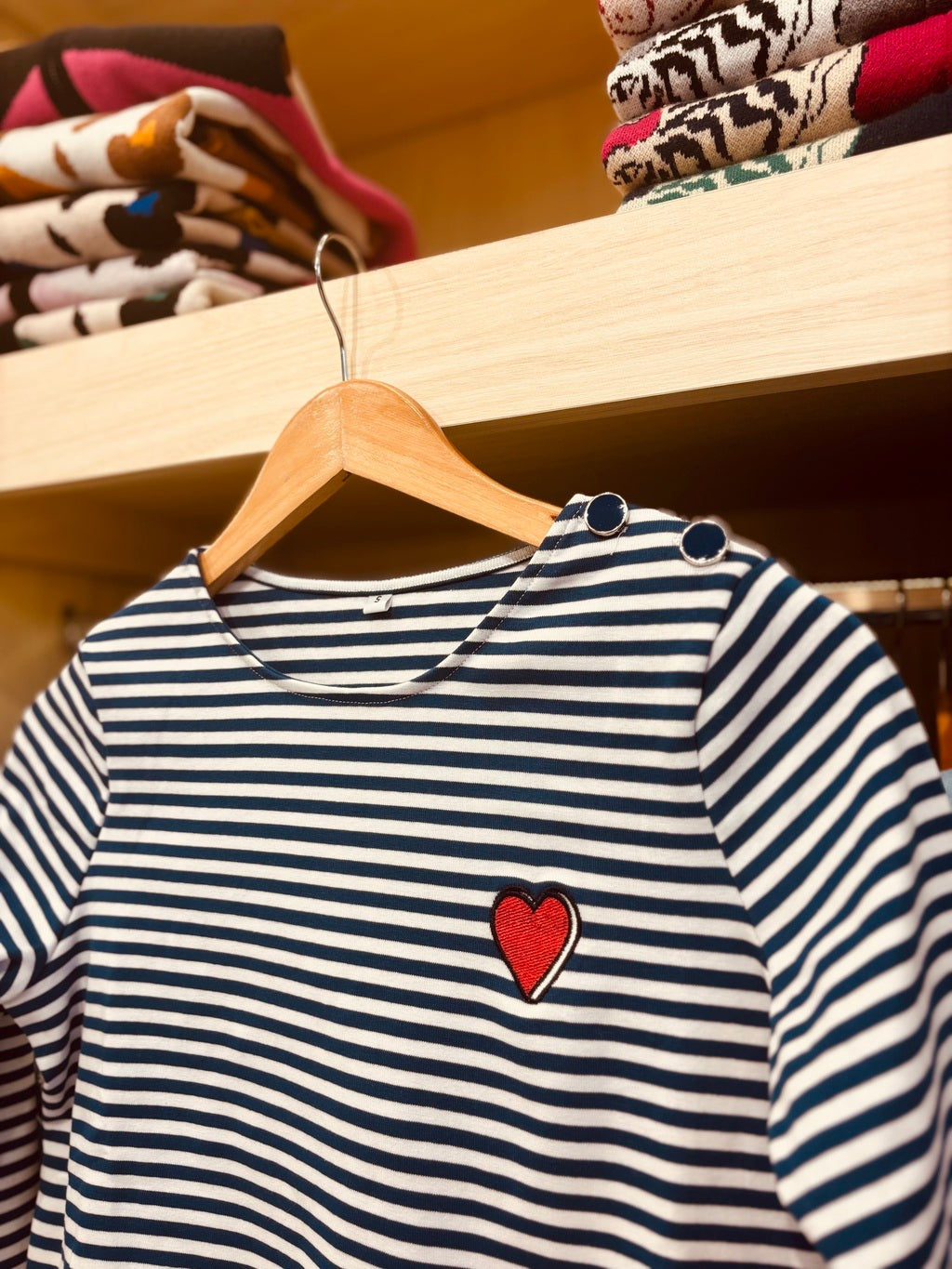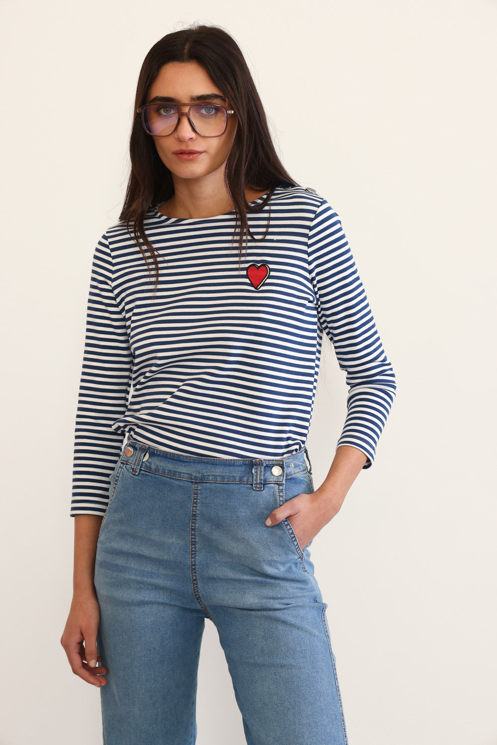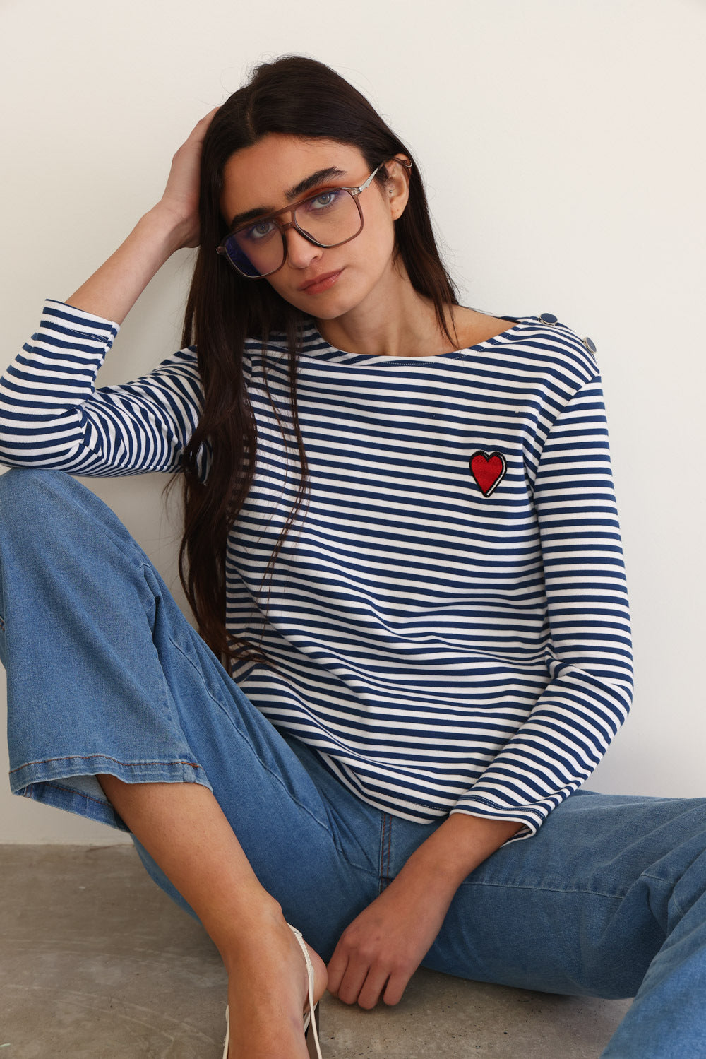 Remera de rib rayada con bordado en corazón y detalle de botones