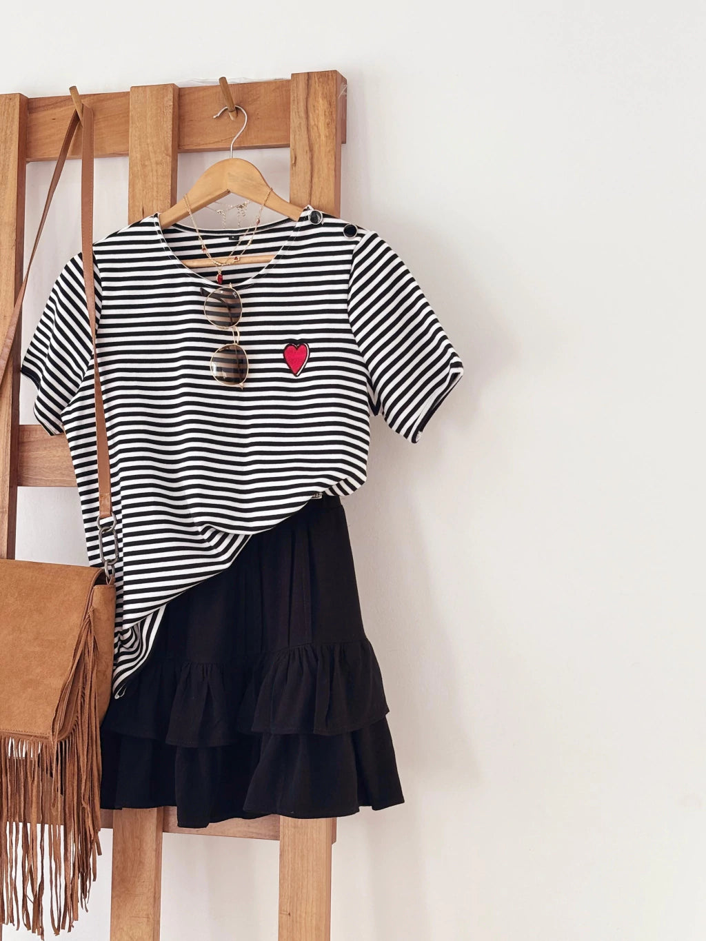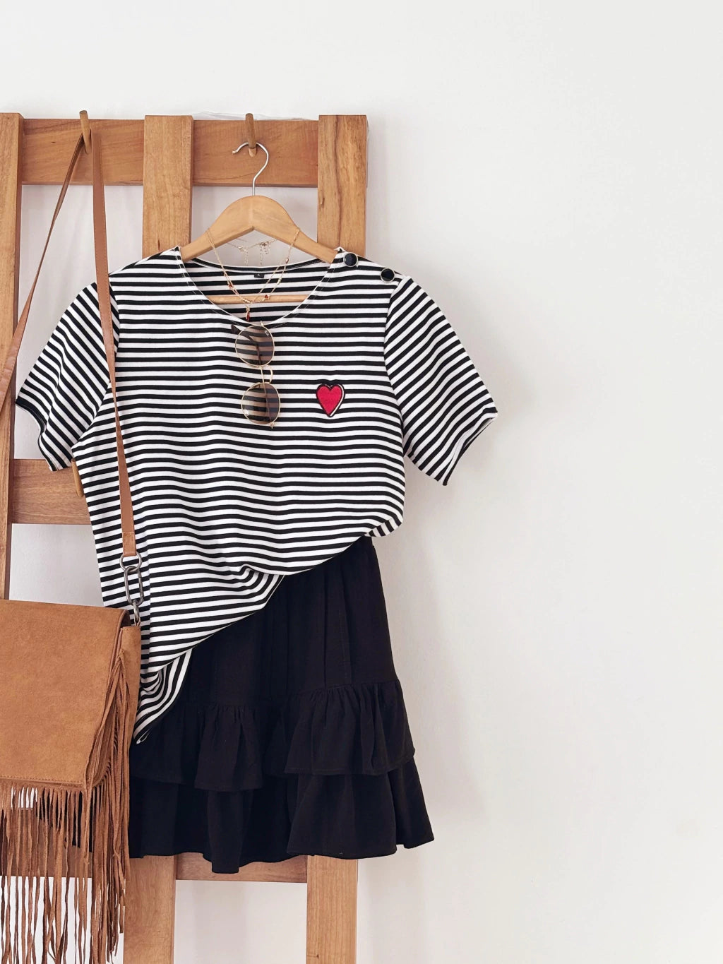 Remera de rib rayada con bordado en corazón y detalle de botones
