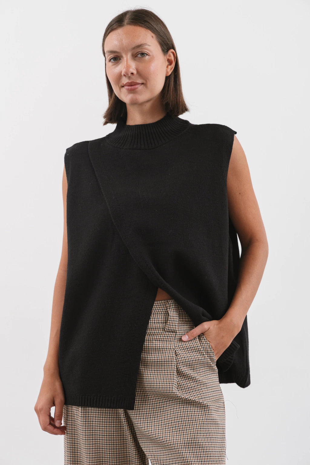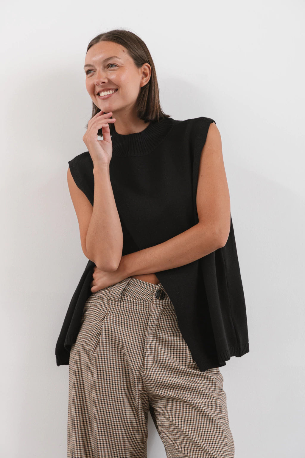 Diseño minimalista con cuello alto. Su corte amplio y relajado lo convierte en una prenda versatil, ideal parae superponer cone camisas.