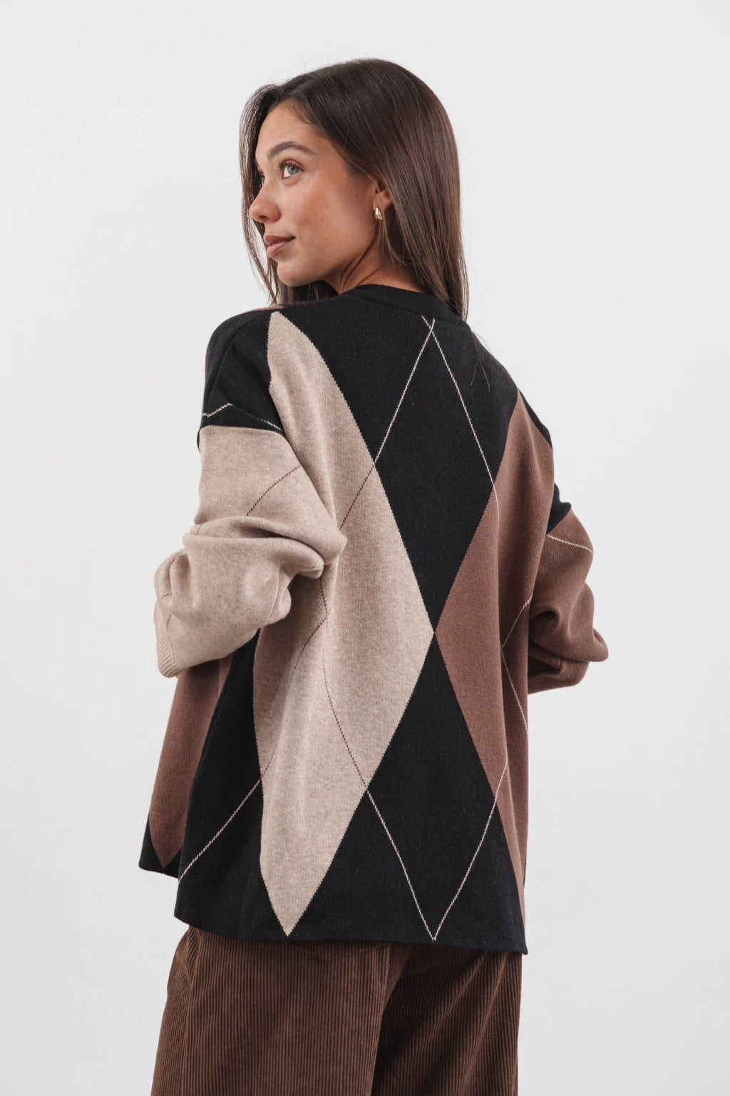 El sweater de rombos grandes aporta presencia y estilo con un diseño atemporal que nunca pasa de moda.