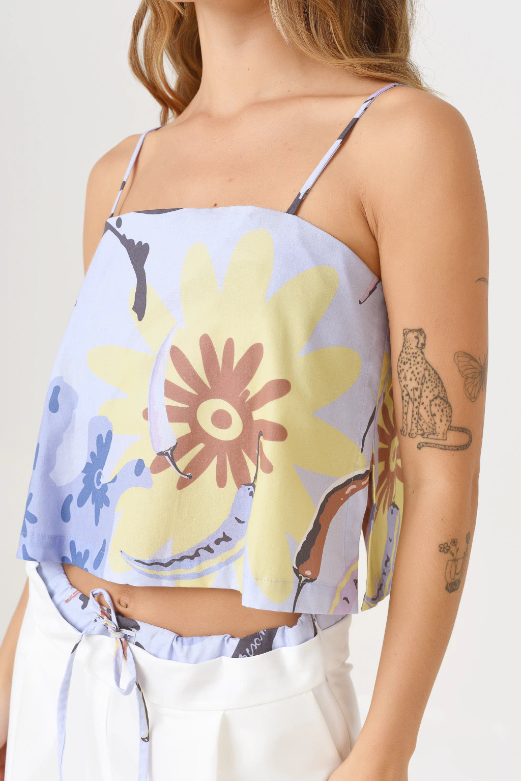 El top Carmen está confeccionado en Poplin liviano, el largo es hasta la primera cadera y tiene tiras regulables. En su interior viene con un top corto como soporte de busto y su acceso es con broches en la espalda. Además tiene dos tajos en los laterales y otro en el acceso.