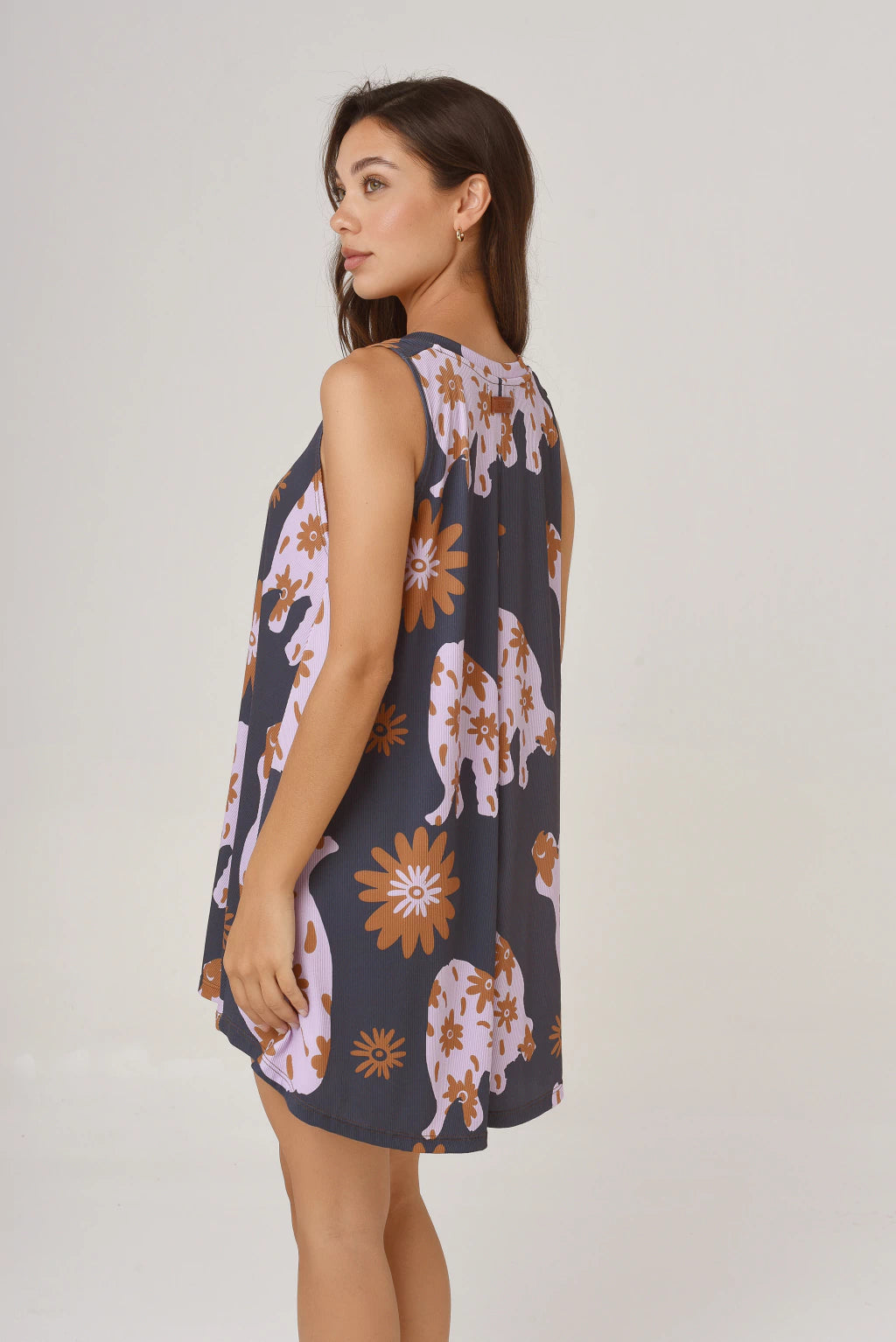 El vestido Kahlo está confeccionado en Morley , tiene falda acampanada y escote V. Es un vestido sin mangas y el largo es hasta las rodillas, será un gran aliado para este verano.