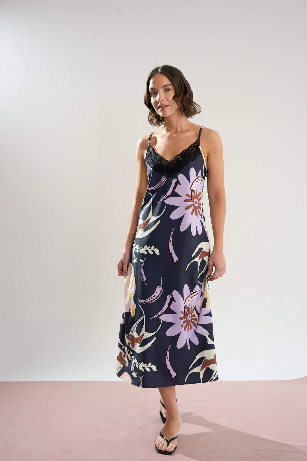 El vestido Luis es de sedita verona, tiene breteles finitos con reguladores, la espalda es cruzada y el frente tiene un detalle en puntilla negra. Es largo hasta los tobillos y el corte es recto.