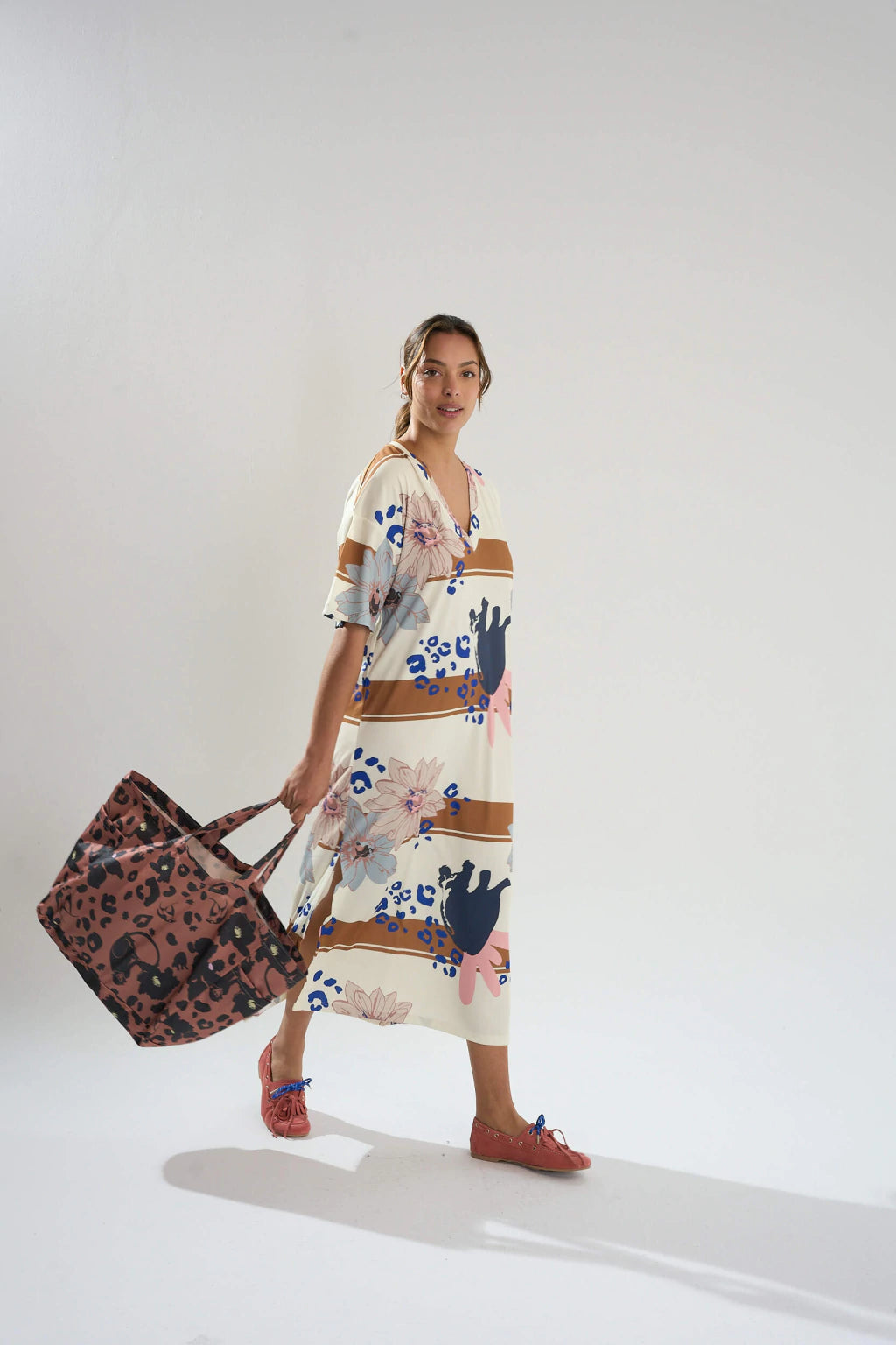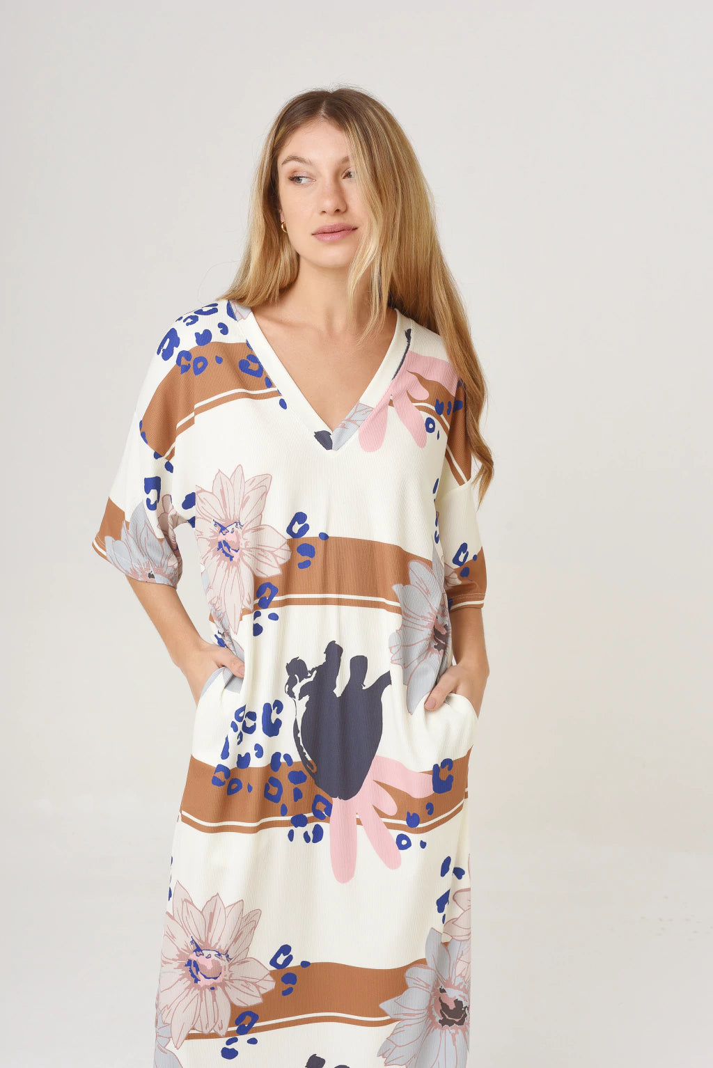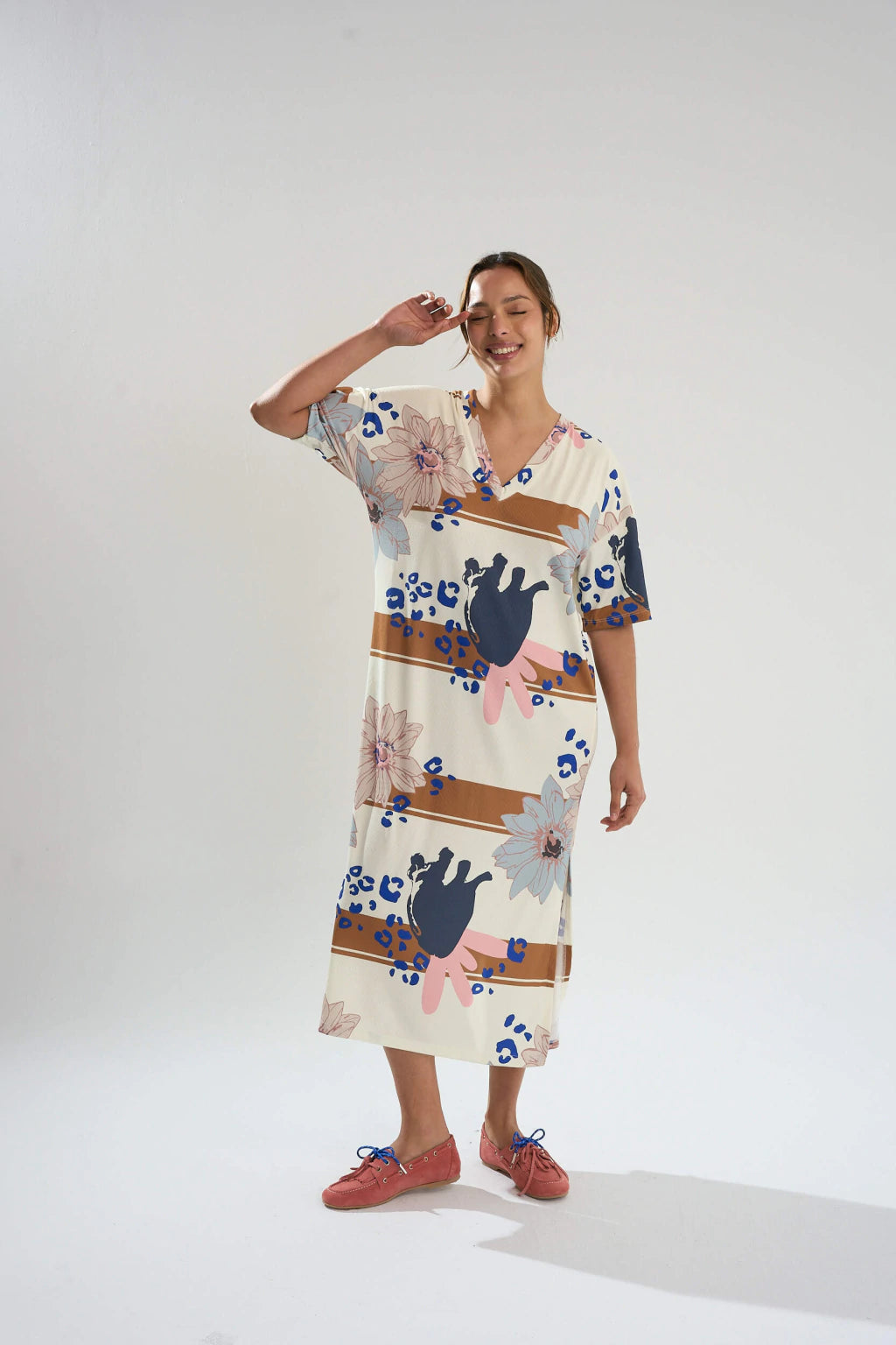 Confeccionado en morley, tiene cuello V y es súper cómodo. Es corte recto, el largo es hasta los tobillos y tiene dos pequeños tajos en cada lateral inferior.