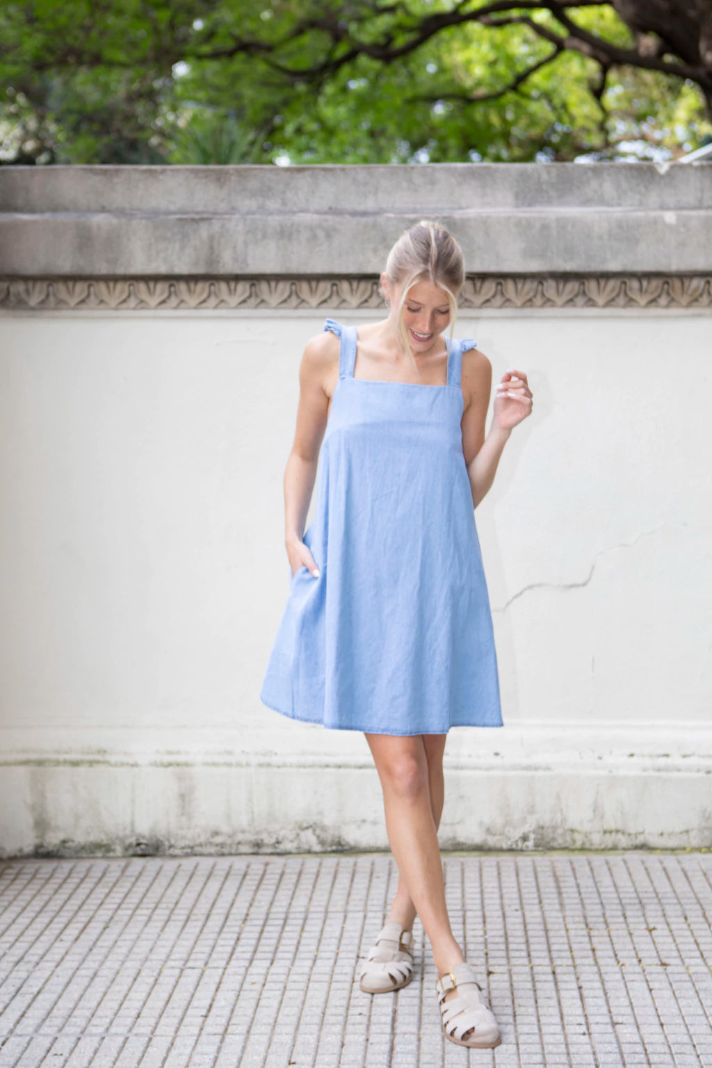 Vestido de Jean camisero amplio con bolsillos y escote cuadrado