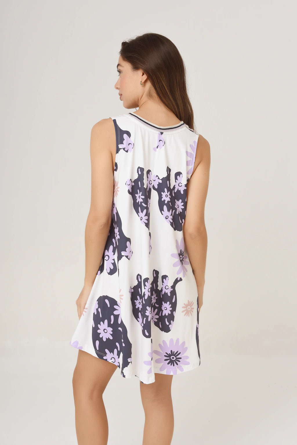 Está confeccionado en modal gamuzado con cuello tejido en color natural, azul y lila. El corte es amplio con cuello redondo y tipo musculosa. Viene en tres talles y tres estampas diferentes.