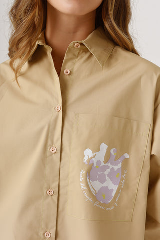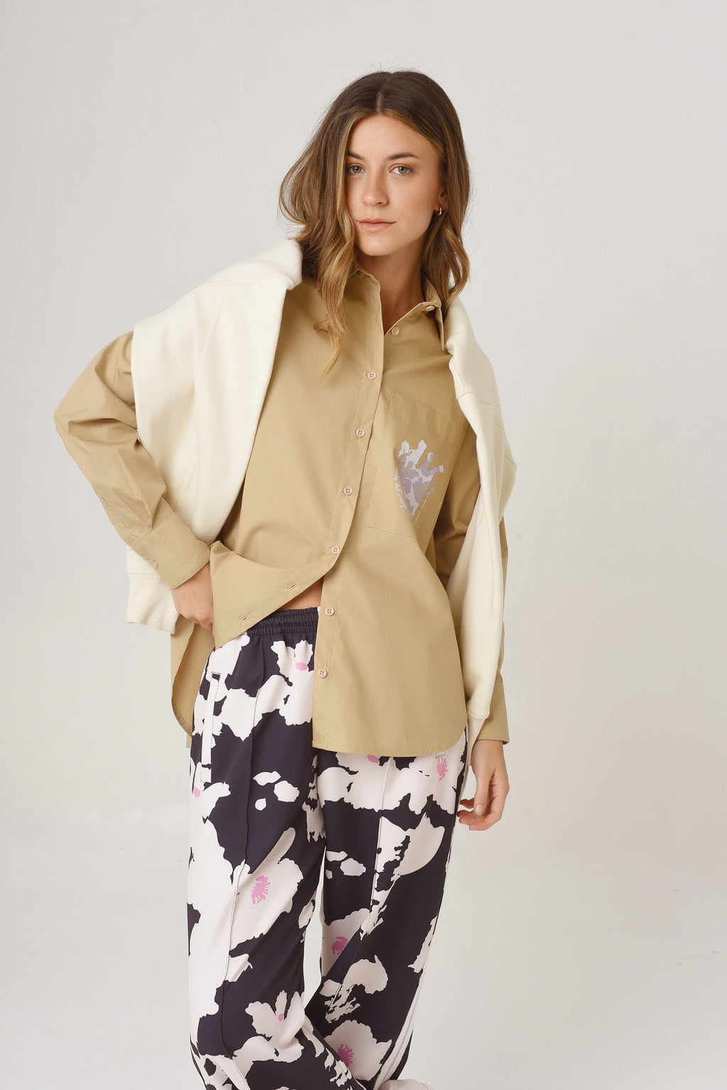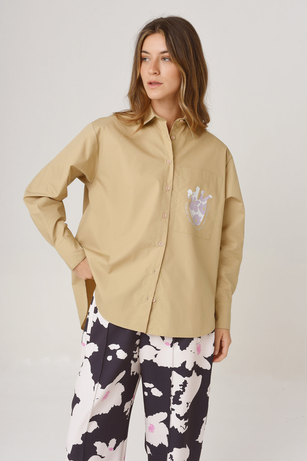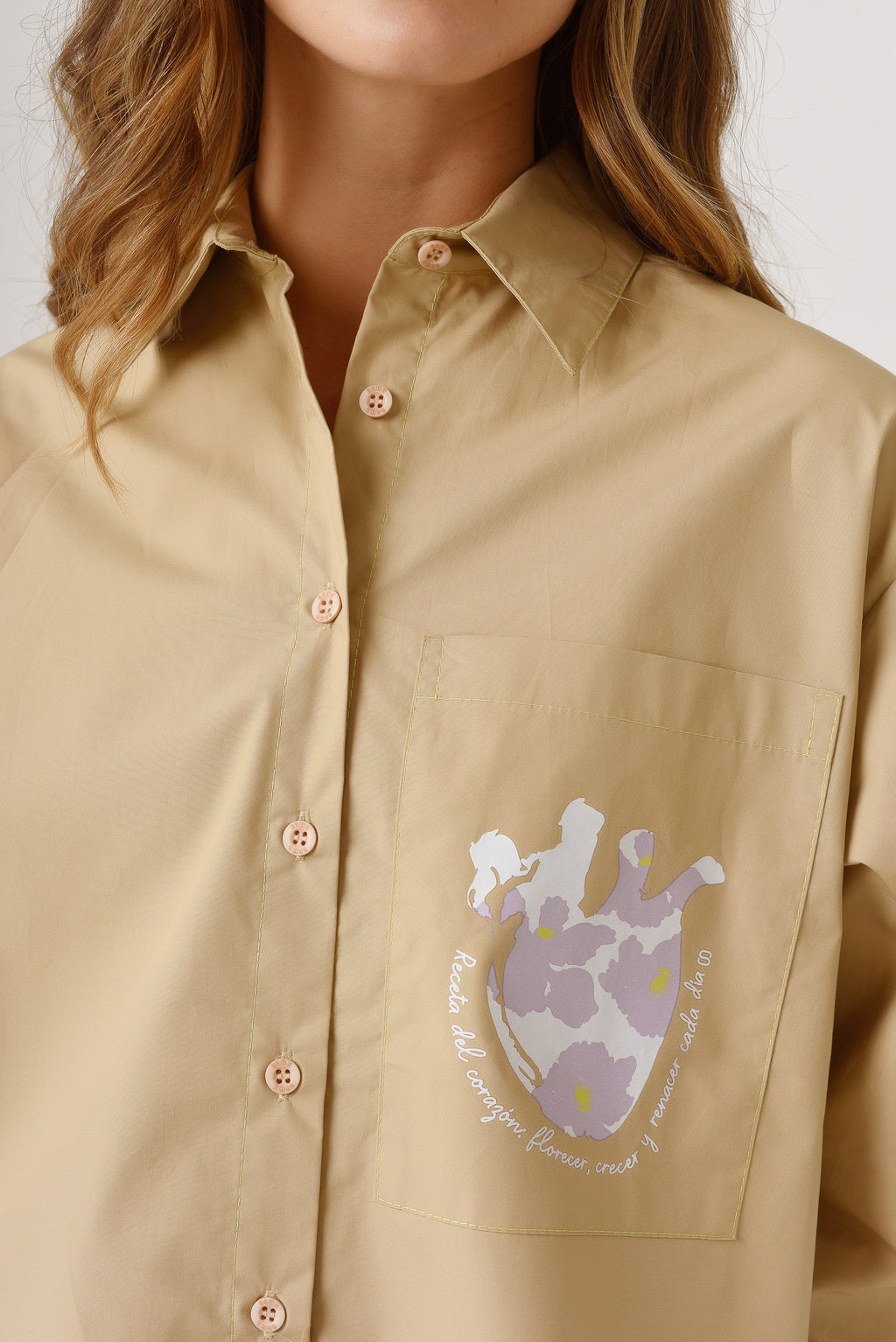 La camisa Paulina está confeccionada en Poplin Liso, tiene 8 botones al frente a tono, es corte oversize y tiene un bolsillo al frente con una pequeña estampa en el mismo. Su terminación es redondeada con un pequeño tajo en cada lateral y tiene un botón en cada puño. Su pespunte es a contratono como detalle.