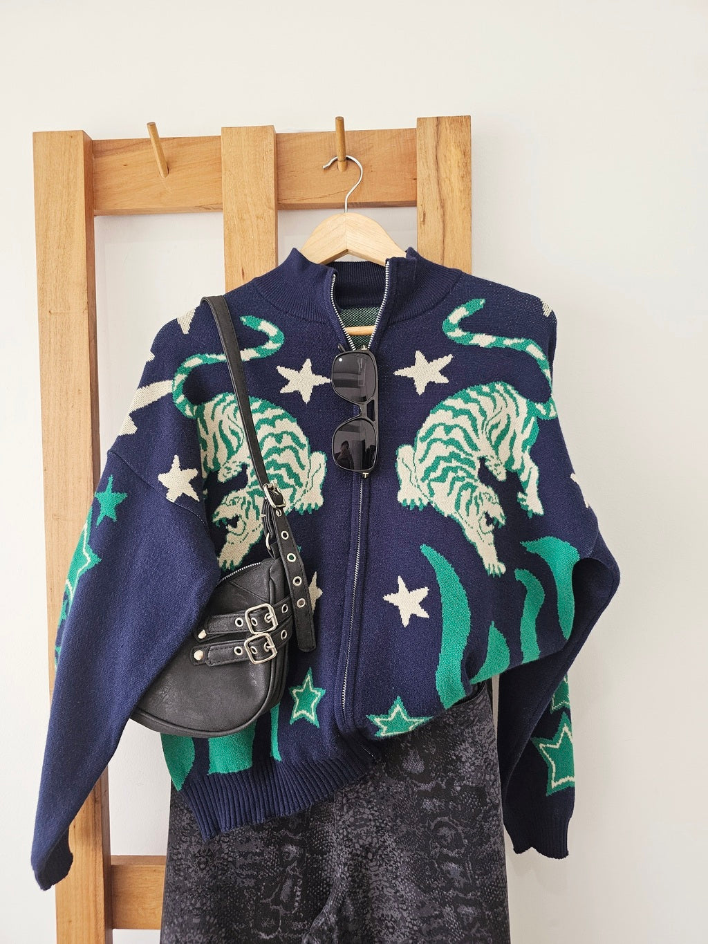Sweater de doble bremer jaquard , mangas combinadas . Cuello polera con cierre.