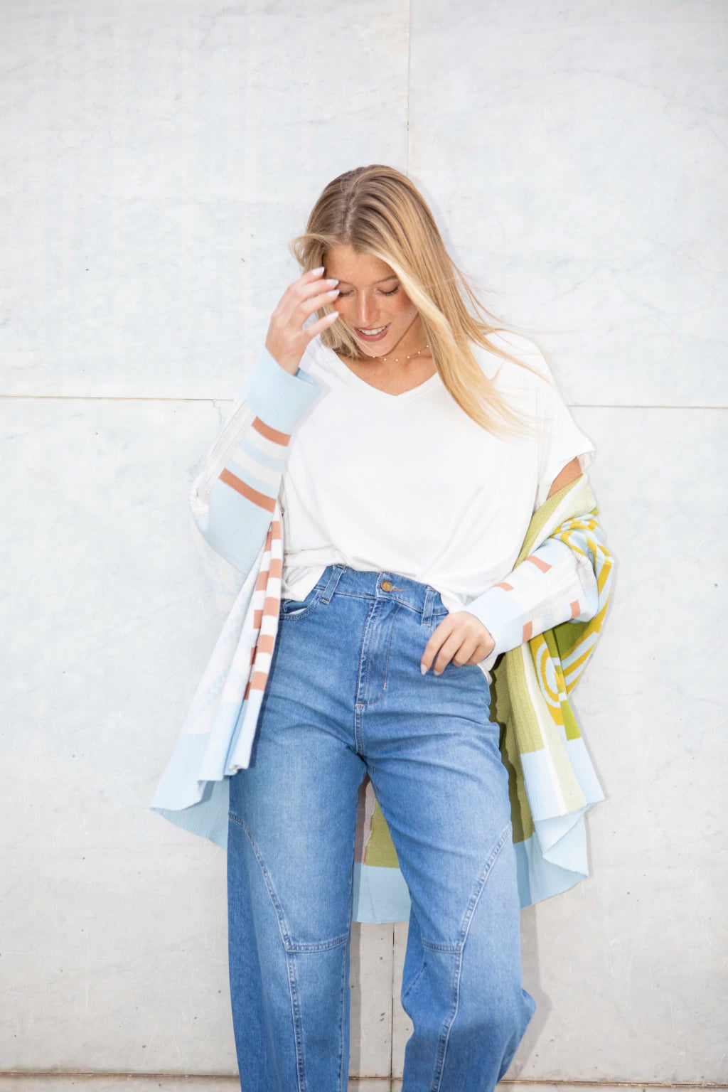 Cardigan de hilado Manhattan a 6 colores con mangas y efectivo trenzado en varias partes.