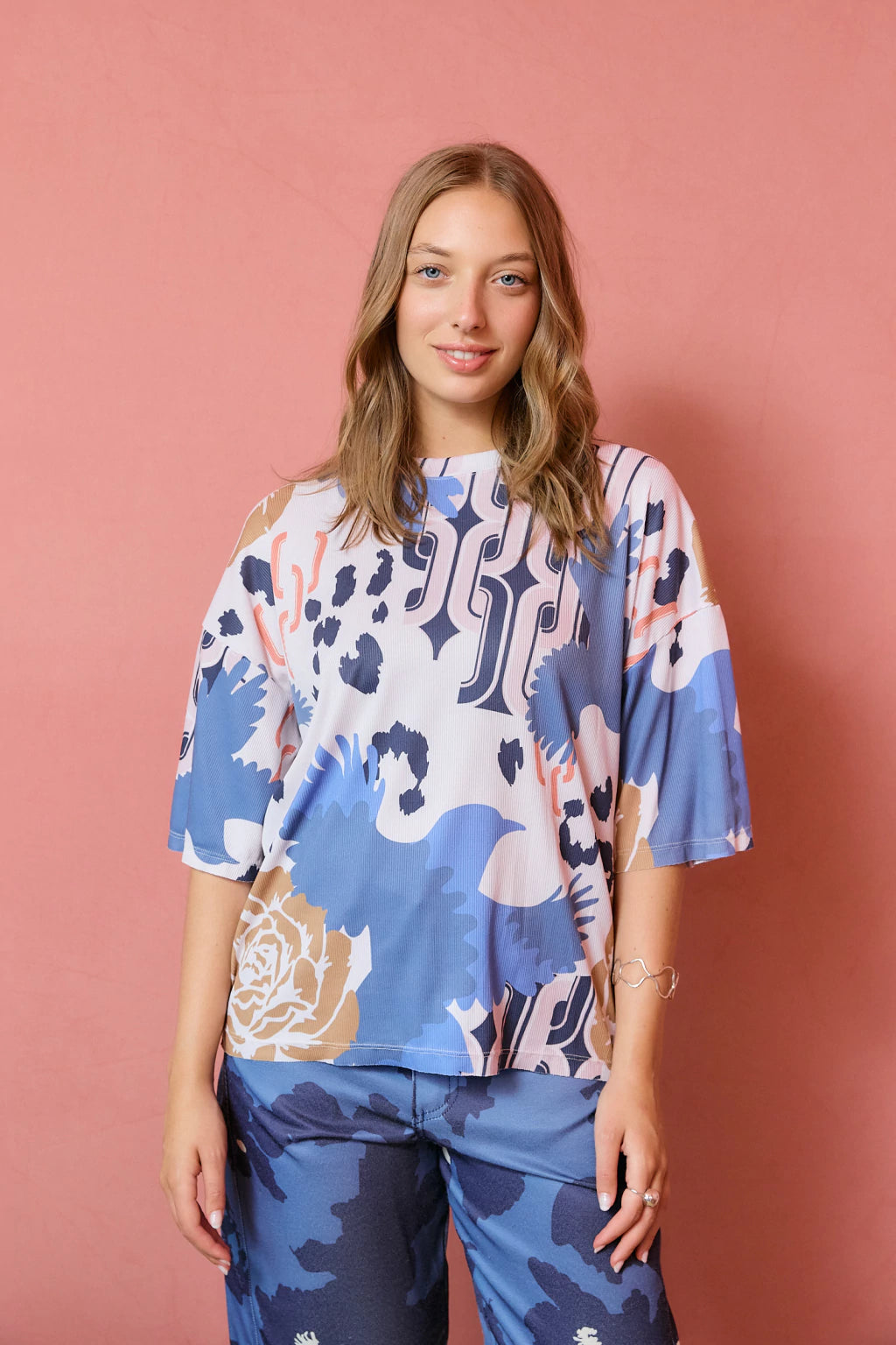 La remera Lima está confeccionada en morley, es corte oversize, larga hasta la segunda cadera y cuello redondo. Posee terminaciones al corte y viene en talle S, M y L.
